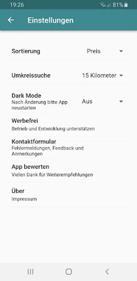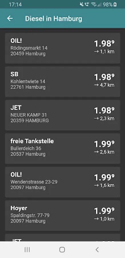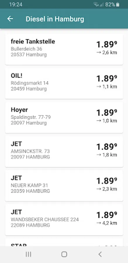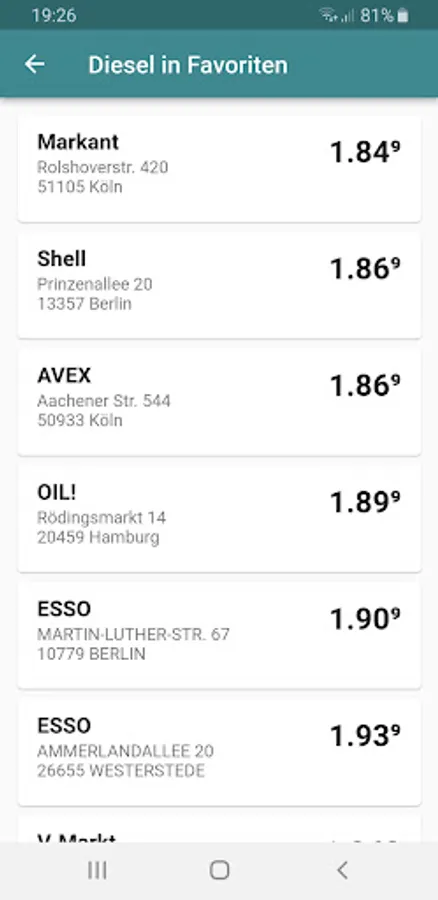 You will then get an overview of the gas stations in the selected location. These are sorted according to fuel prices: cheap gas stations are at the top, expensive gas stations are at the bottom. If you don't get fuel at a gas station because it's closed, for example, it will be displayed below the results at the end without a price.