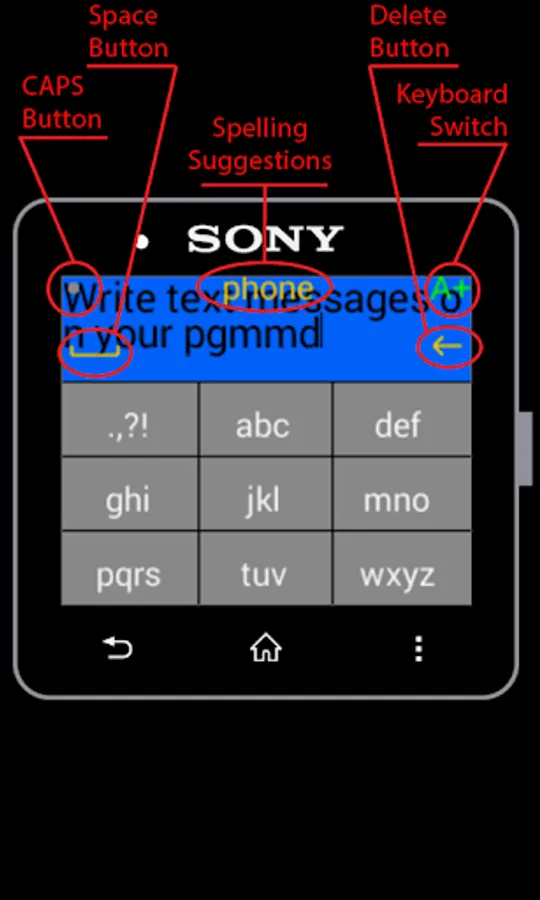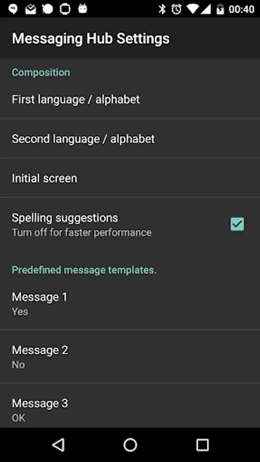 Message composition using T9 keyboard with spelling suggestions. You can also choose from the templates which you can define in the app settings.