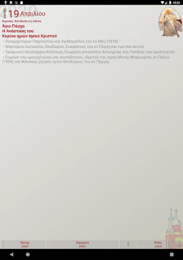 Displays the full calendar of feasts and saints, as well as fasting and period of the year information, for any day, past and future. Links to daily readings and the typikon are also provided. Optionally, navigate to any day, past or future, on a date basis or in regard to the paschal period.