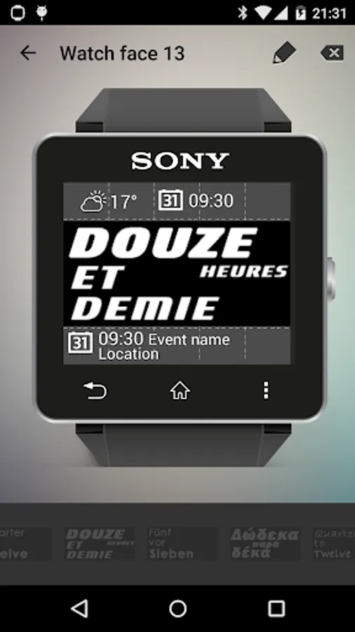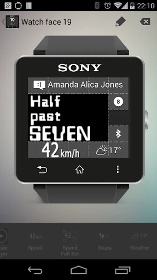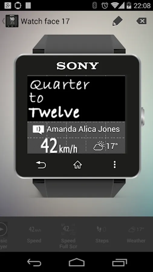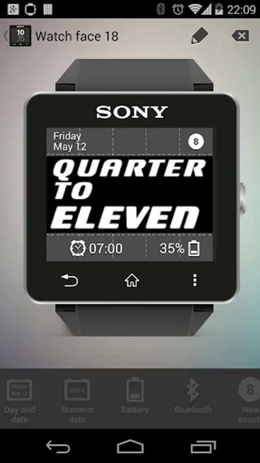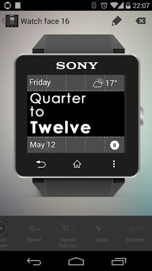 Unique! Fuzzy clocks for your Sony SmartWatch2. Eight different faces. They don't occupy the full screen of your watch, so you can place additional widgets on it.