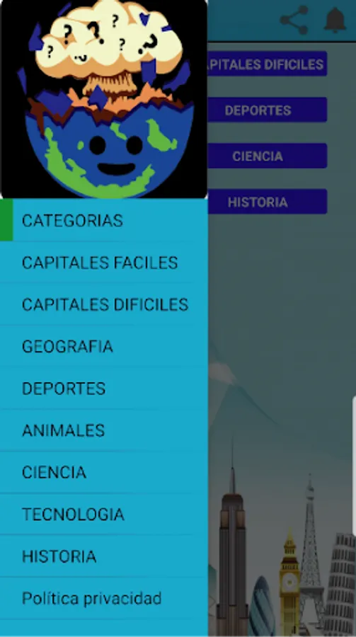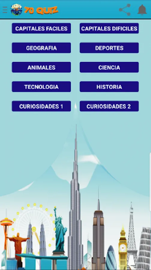 70 Quiz wants your knowledge of general culture to grow more and not only in text, but that each image in each question is something pleasant from each country, animal, technology, etc. and to achieve this we divide it into categories that are: