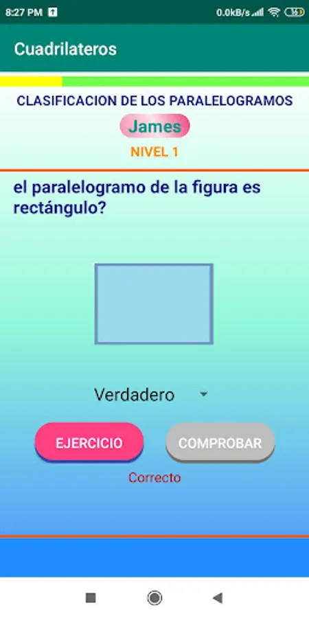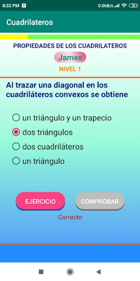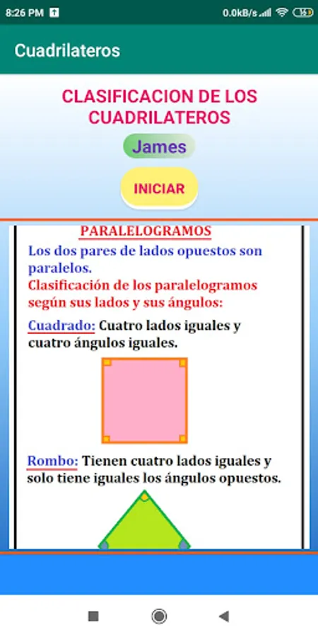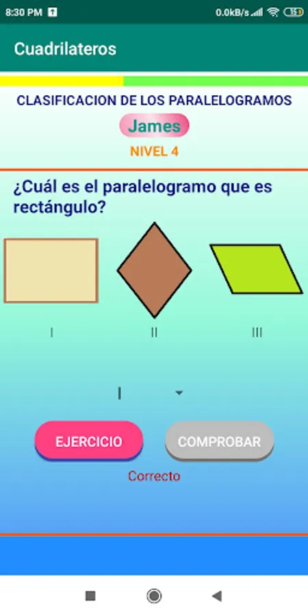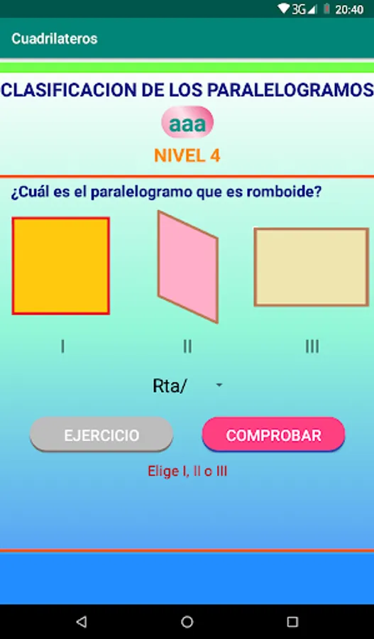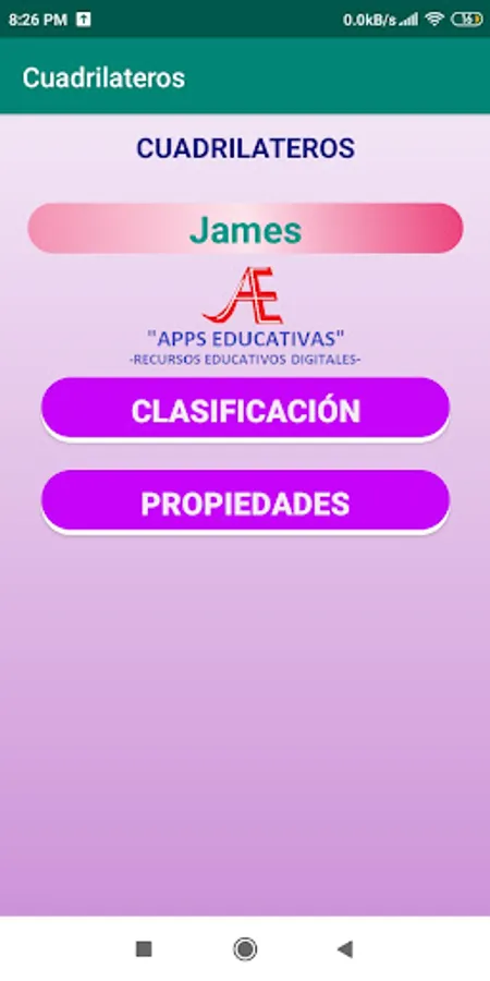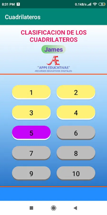 Consta de 2 opciones: la primera relacionada con la clasificación de los cuadriláteros que consta de 10 niveles y la segunda trata de las propiedades de los cuadriláteros que también trae 10 niveles.