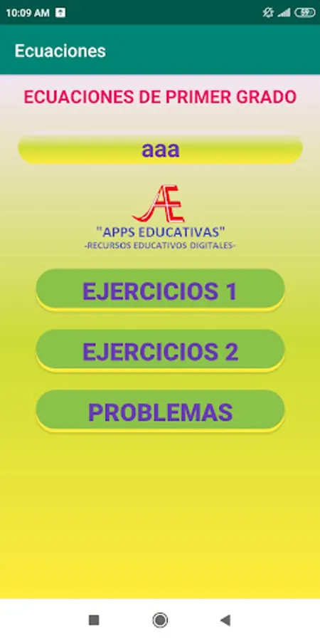 The “First Degree Equations” application offers simple exercises on linear or first degree equations. It consists of 3 options: Exercises 1 presents linear equations where the solutions are positive integers, Exercises 2 where the solutions can be positive and negative integers and the Problems option, where exercises on the application of first degree equations with simple problems are presented. .