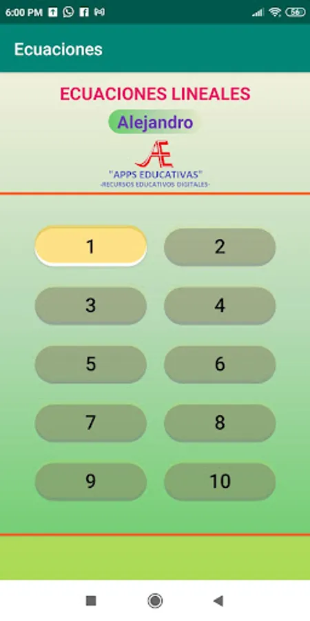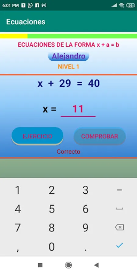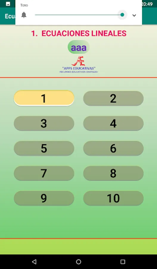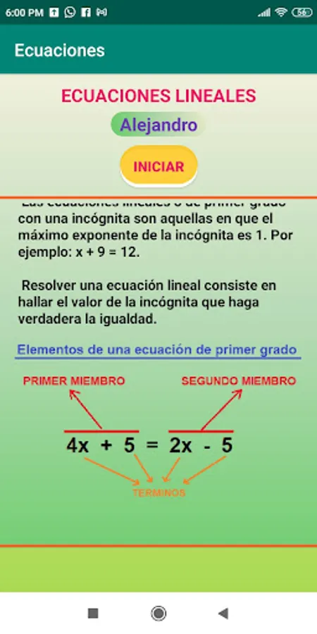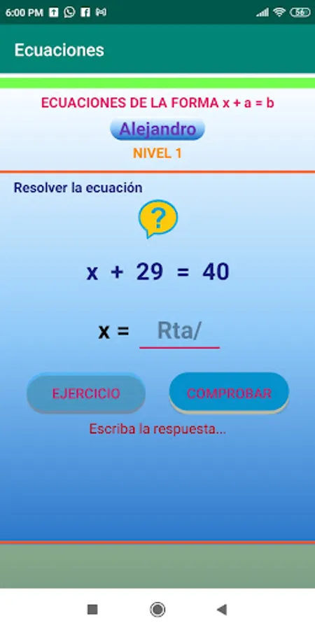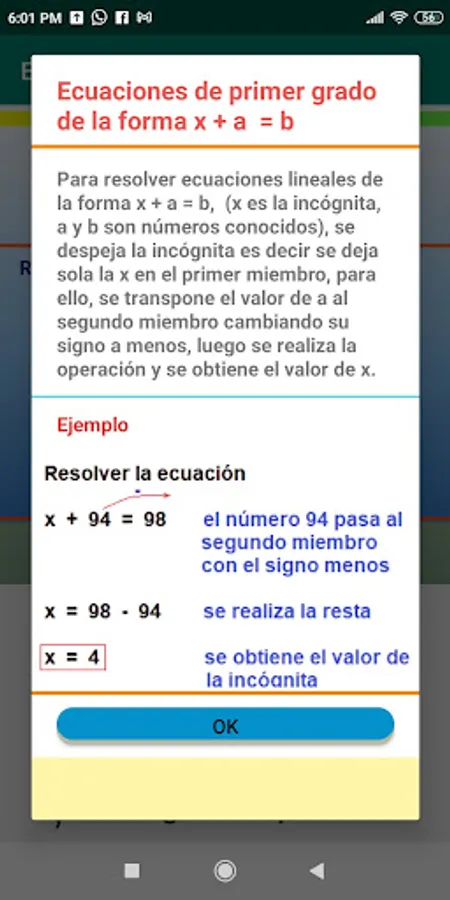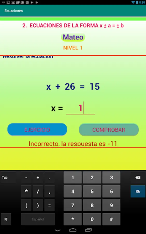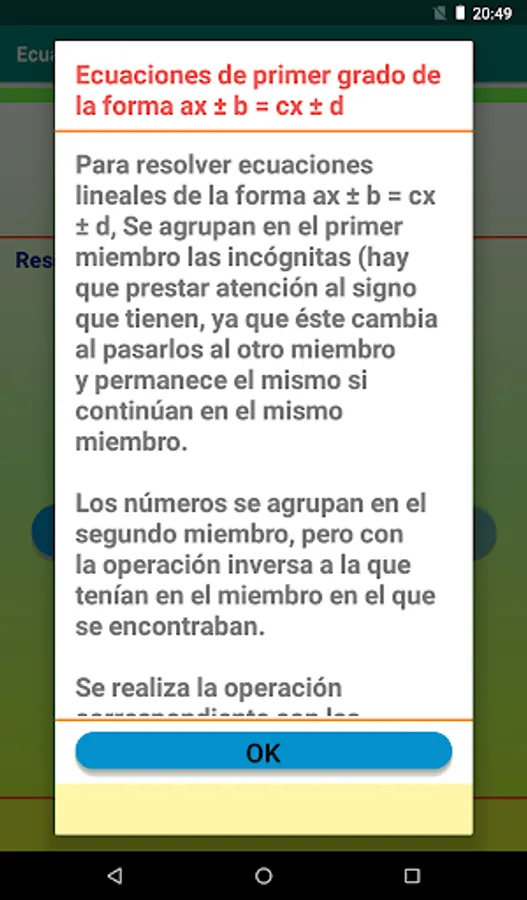 In some levels, help examples are provided so that the student has a guide on how to solve the proposed equations.