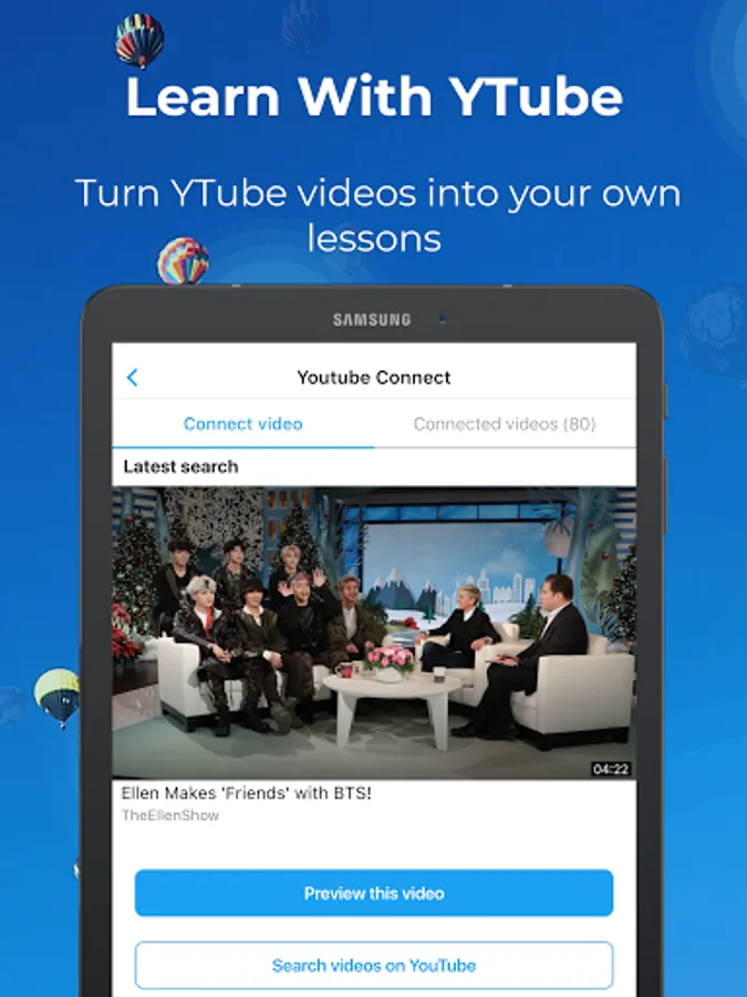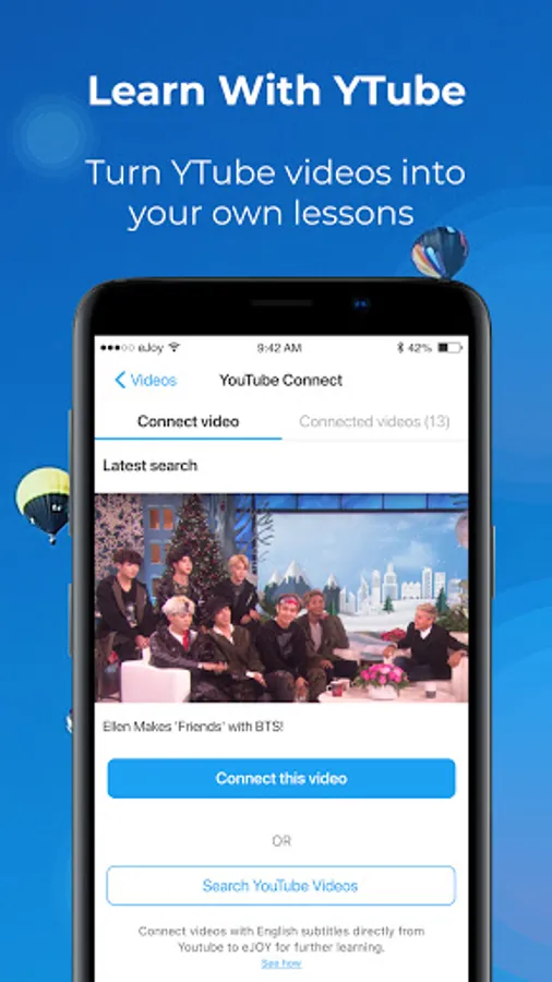 • Connect a video you want to learn with YTube Connect feature or choose one from our daily updated collections based on your English level and topic