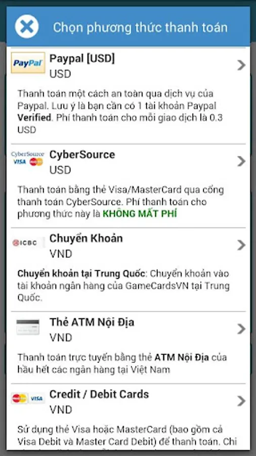 Phân phối tất cả các loại thẻ game online của Việt Nam bao gồm thẻ Zing, FPT Gate, BIT, VTC VCoin, Garena, Oncash và các loại thẻ Mobi nạp game như MobiFone, VinaPhone và Viettel. Nhận thanh toán qua Paypal, Thẻ Visa, Master Card, JCB. Chuyển khoản ngân hàng tại Australia và Hàn Quốc. Thời gian chờ nhận thẻ sau khi thanh toán xong là 3 phút.