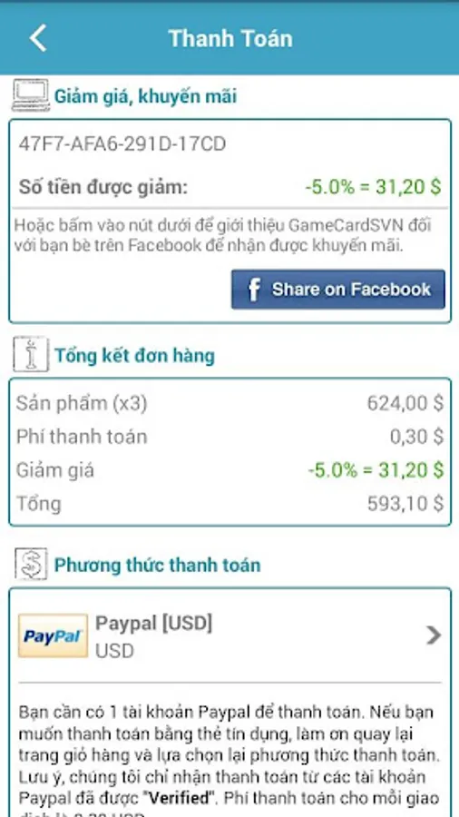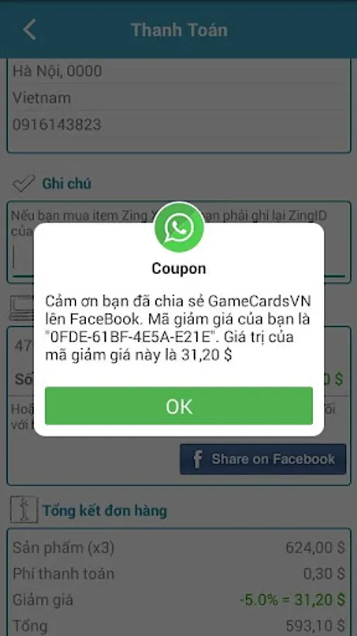 Đặc biệt - khi mua hàng qua app của gamecardsvn.com - quý khách hàng luôn có lựa chọn giới thiệu gamecardsvn tới bạn bè qua facebook bằng nút chia sẻ trong app và nhận ngay 1 voucher giảm giá 3 - 5% có hiệu lực trong vòng 30 ngày.