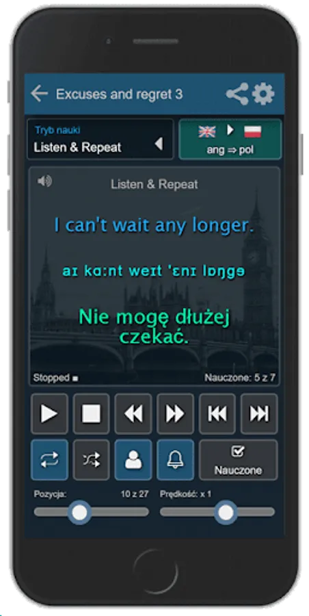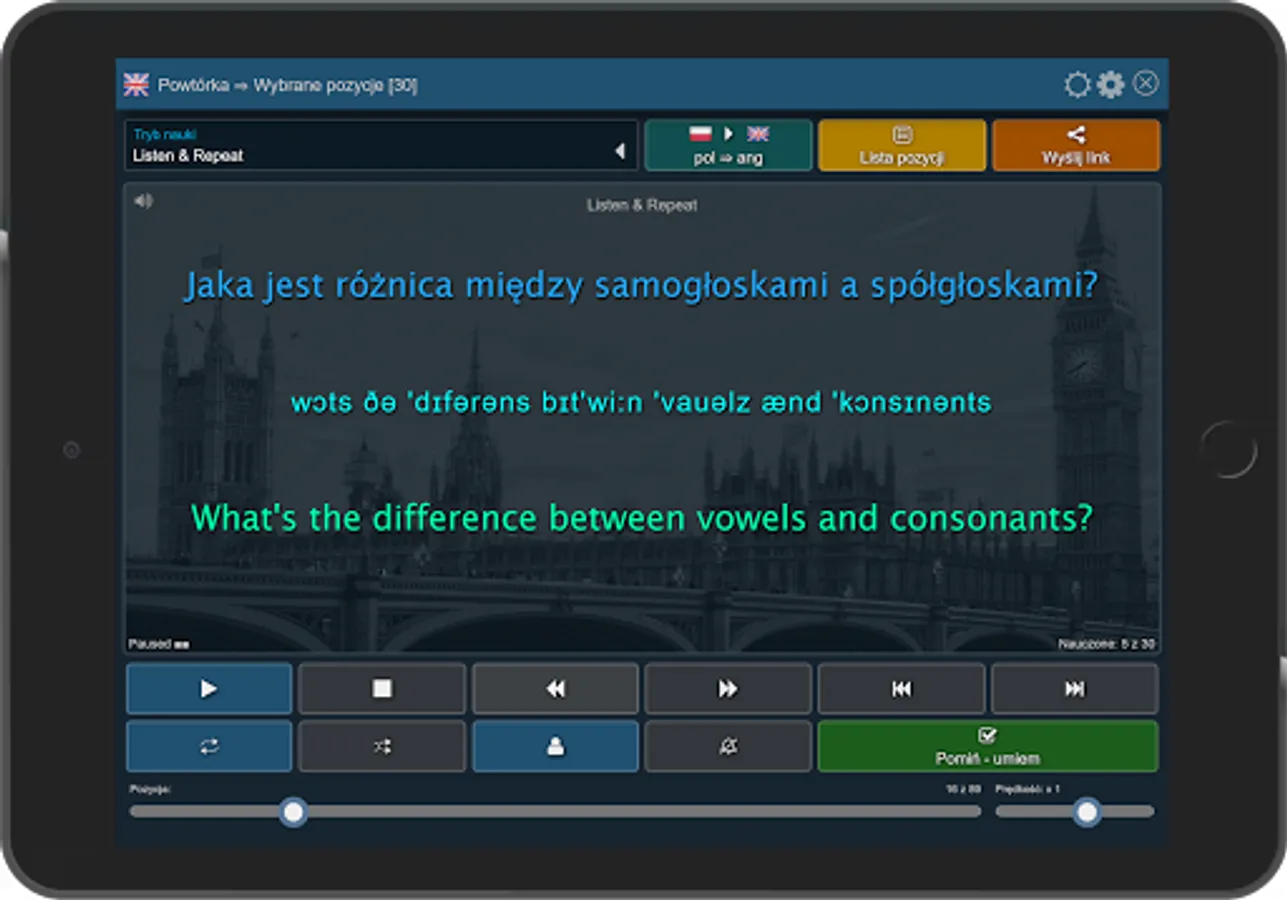 Thanks to the built-in "Listen & Repeat" function, you can listen to the voiceover's MP3 recordings non-stop (eg in the car, on the way to work) and polish your pronunciation and accent, gradually turning off the mastered words and expressions.