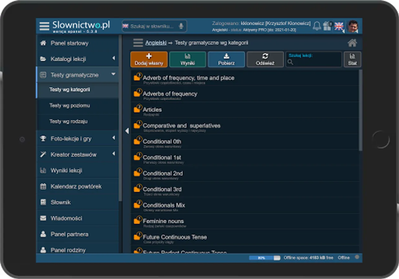 Full access to lessons from the course along with the teacher's recordings in the PRO version is available as part of a subscription to the Slownictwo.pl website. In the current free version, after logging in, you can download dozens of free lessons of various levels of advancement.