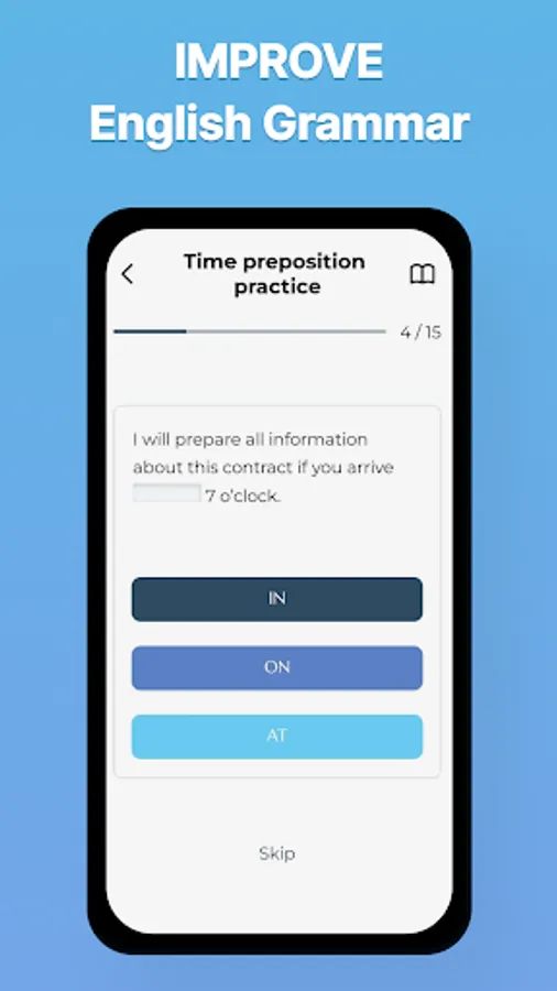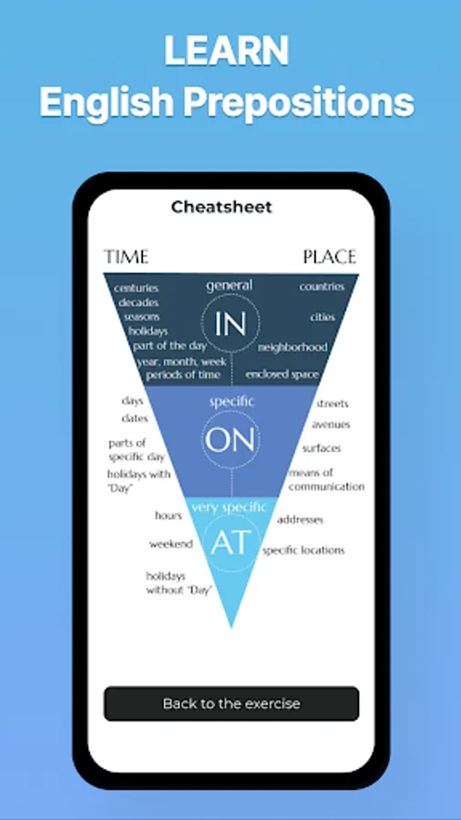 With the help of our application with the exercises you will learn the rules for using English prepositions in, on, at and learn the types of prepositions, examples and exceptions. Simple and accessible, without complex terms, so that beginners can learn English or people who do not remember the basics of English well can understand it and put it into practice.