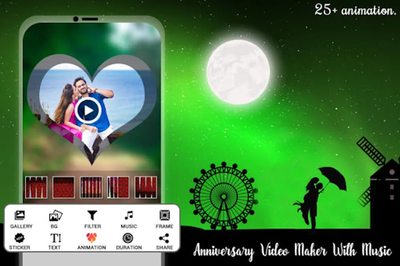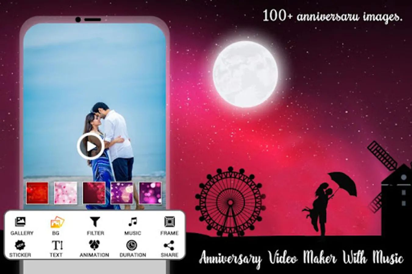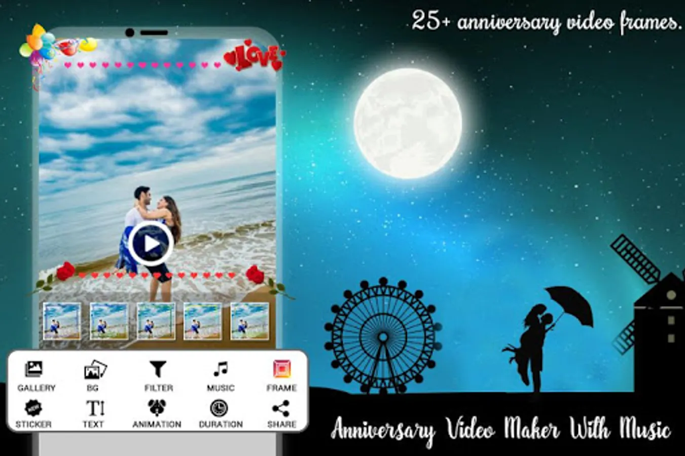 Anniversary Video Maker with Music App easy to use. You can make video with pictures and music from your mobile gallery. Create Amazing Video with app which have over 20 animation theme, Anniversary frame.