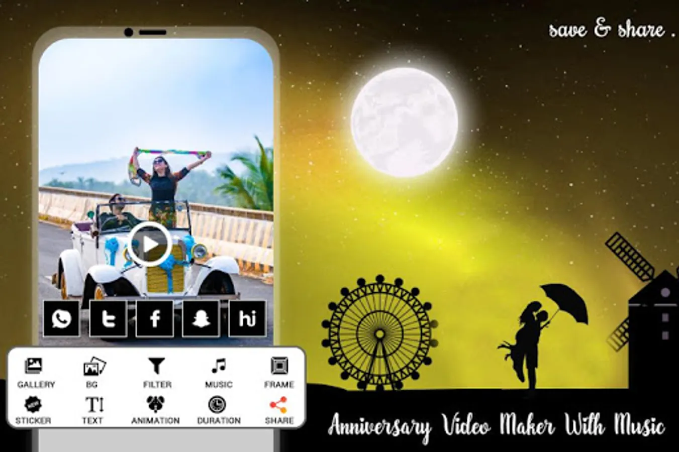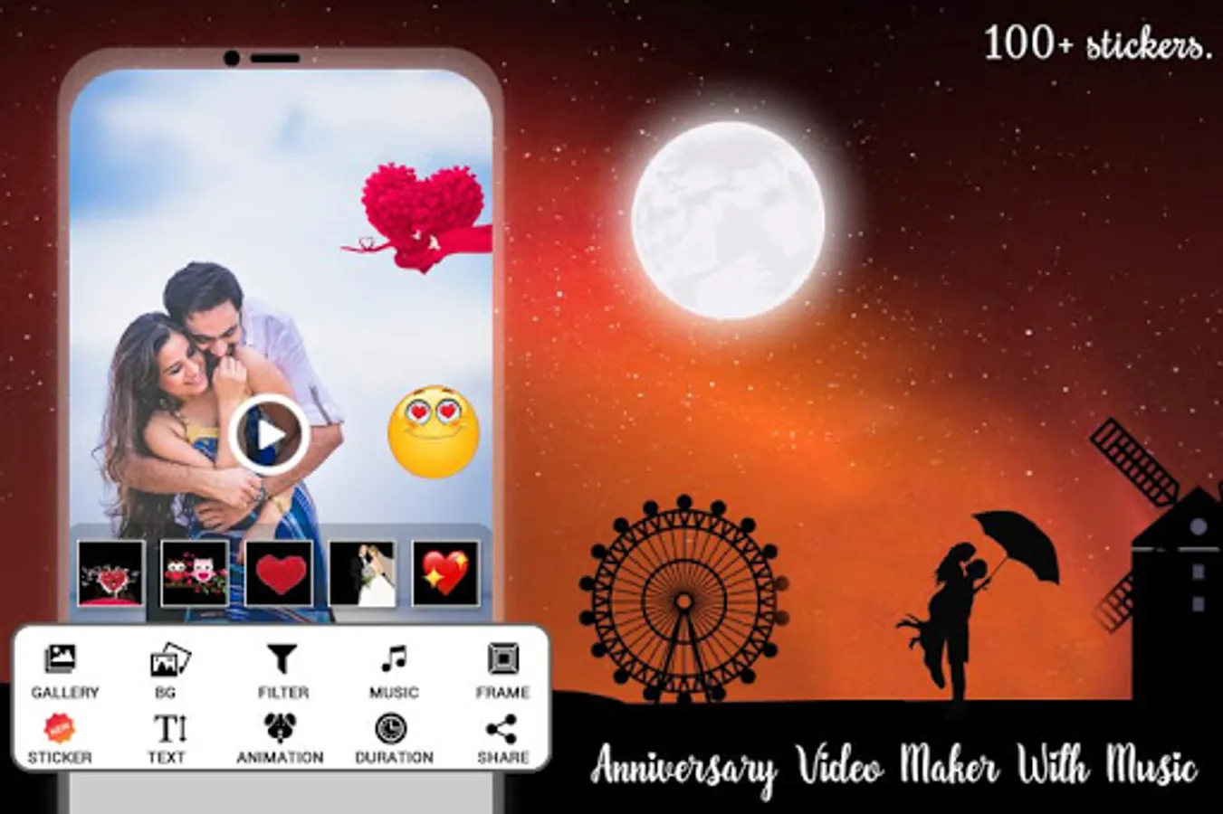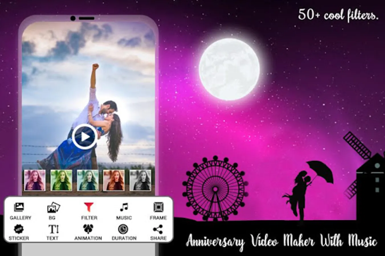 Anniversary Video Maker with Music App easy to use. You can make video with pictures and music from your mobile gallery. Create Amazing Video with app which have over 20 animation theme, Anniversary frame.