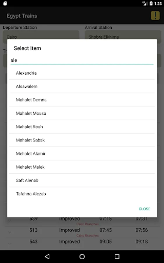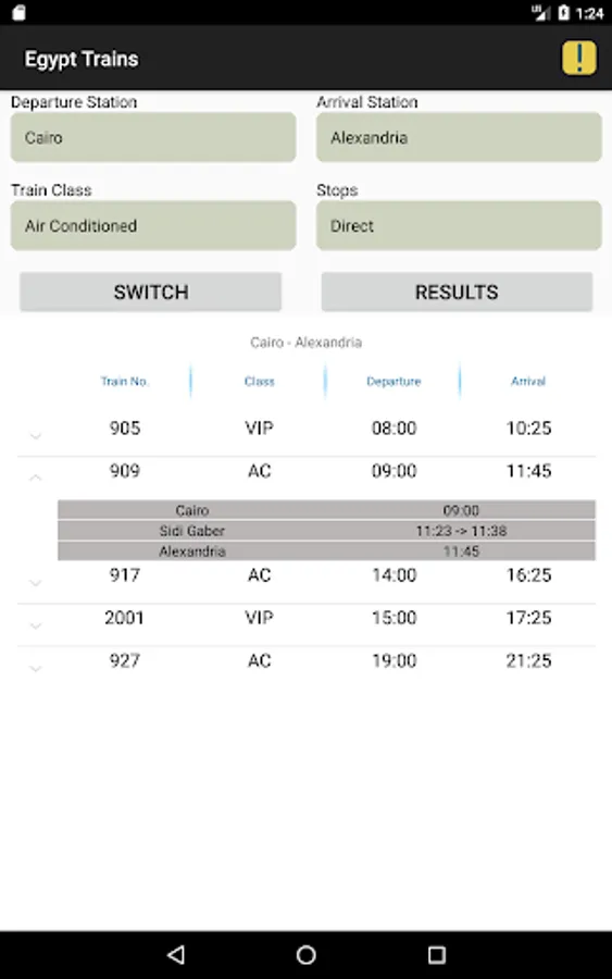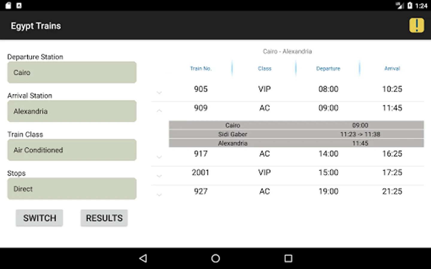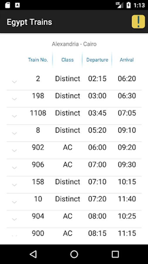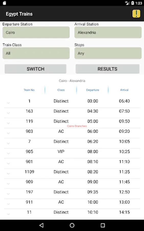 Display timetables of trains between any pair of more than 500 stations in Egypt with the option to search for specific train class.