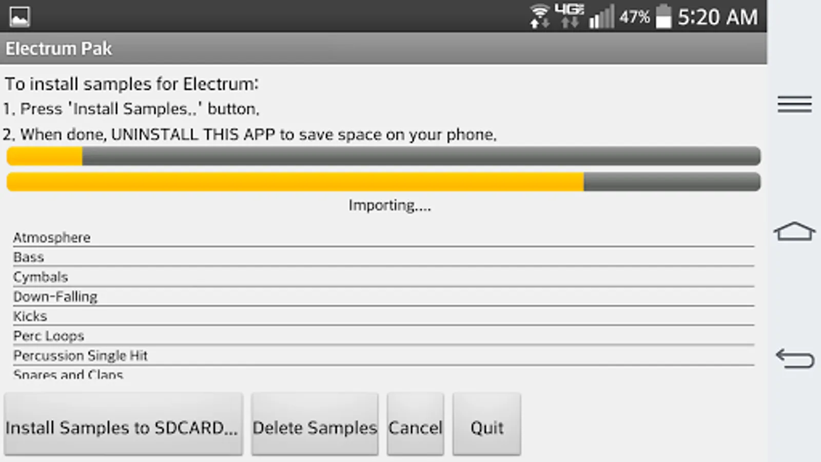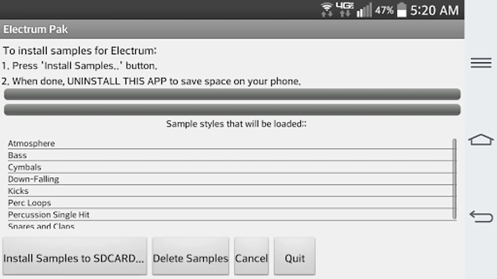 Install this app, press the "install" button, and when done you can exit and uninstall this pak to save space on your phone. It copies the samples to your SDCARD