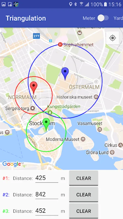 This app can locate the position of a target if you know its distance from 2-3 locations. Place marker on a map and specify its distance to the target. A marked circle will be displayed on the map. Do this for additional points and then the target location is where the circles intersects.