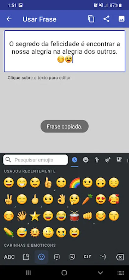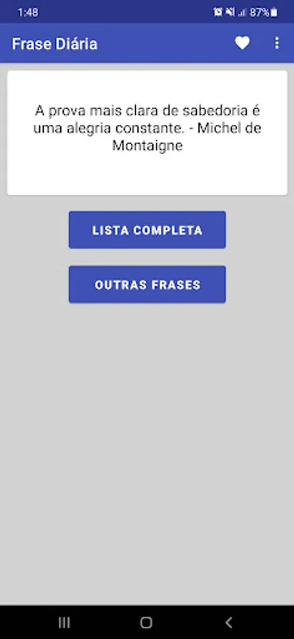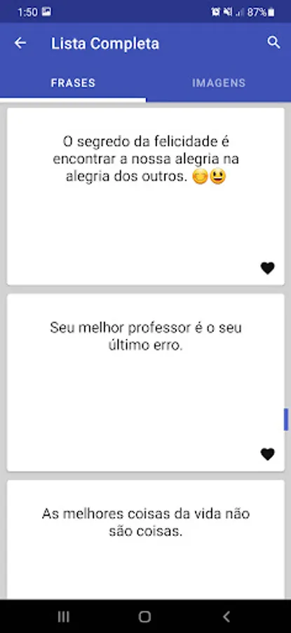 With the Cute Phrases app you'll have the beautiful phrase of the day and a list with several options for phrases for WhatsApp status, phrases for photos, Instagram biography and sharing on Facebook, Twitter and any other application and social network.