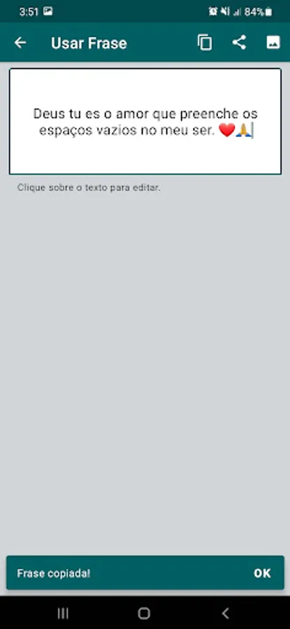 You will be able to share evangelical messages on Facebook, copy the evangelical phrases for WhatsApp status, phrases for photos and Instagram bio. The app also has evangelical phrases with images ready for you to use and allows you to create your own images with phrases using your photos, all easily and quickly.