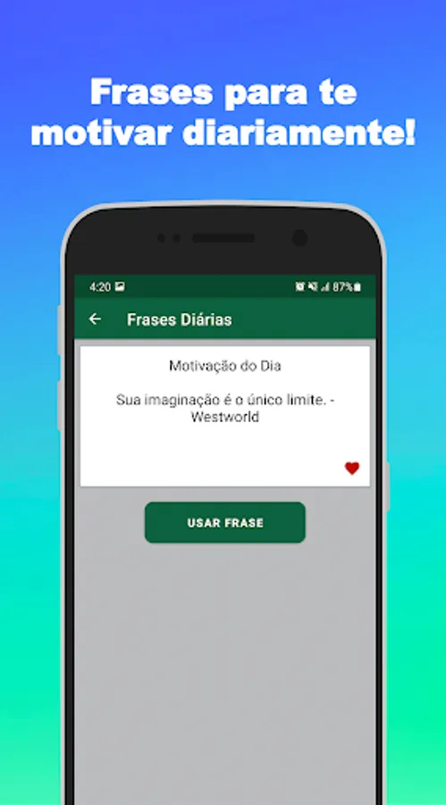 The Motivation Phrases app brings you phrases for daily motivation, there are thousands of attitude phrases, self confidence, self help, thoughts, faith, reflection, success, God, to keep you motivated on the day.