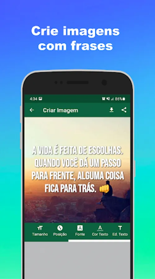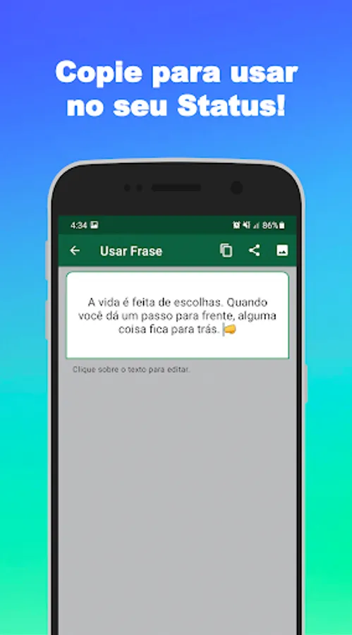 Every day you will have a motivational phrase in the morning and at night, being able to use the phrases for status of WhatsApp, Telegram, Tumblr, Instagram bio, captions for photos, etc. You can also use motivational phrases to create images using your favorite photos, and you can share them with your friends and family via Facebook, Twitter and Instagram stories.