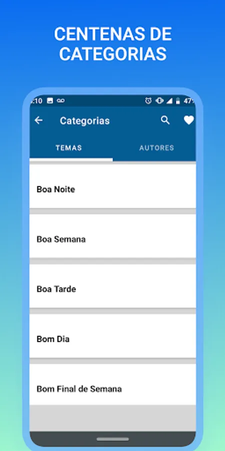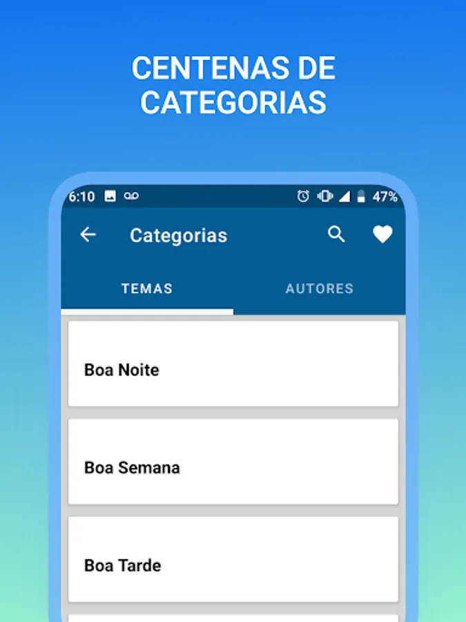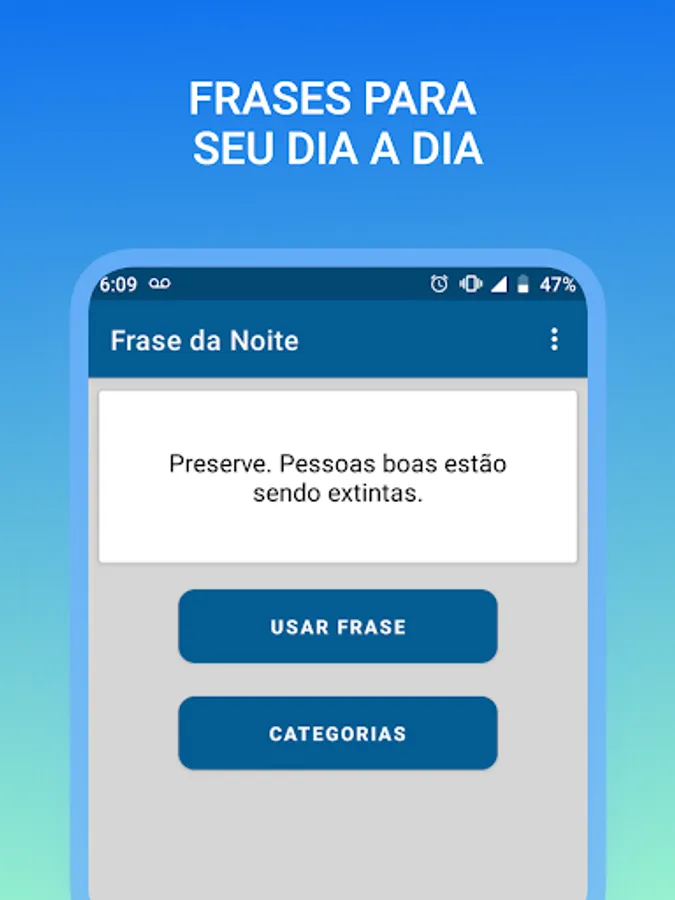 With the Frases para Status app you have phrases and status 2023 separated into themes and authors. The app has phrases for everything, for all occasions and subjects, they are perfect for you to use at all times in your life. There are more than 400 categories available, with good morning phrases, good afternoon and good night, love, hints, maloka, motivation, reflection, thoughts, birthday, verses, among other options for you to share and use as captions and phrases for photos, profile, biography for Instagram and status for WhatsApp.