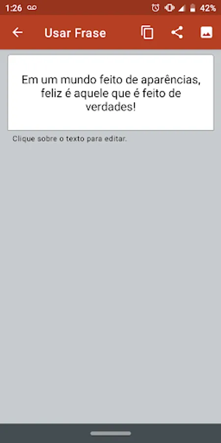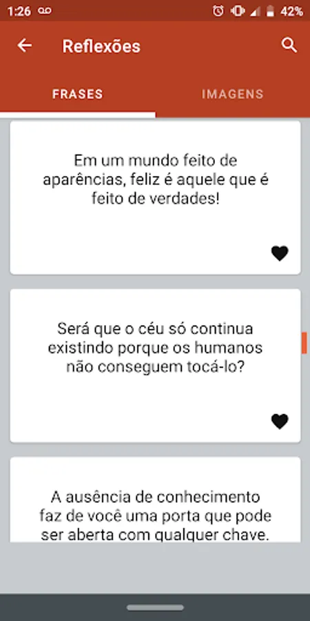 With the Phrase to Reflect app you will have reflection for everyday life and a list with hundreds of reflection phrases for you to reflect on life and use as phrases for WhatsApp status, photos, create images with phrases, etc.