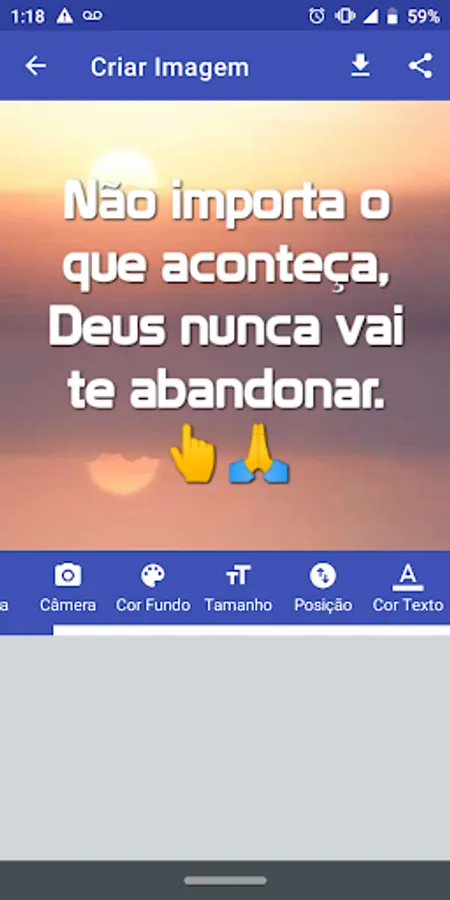 The application Phrases of God with Images has hundreds of phrases ready for you to express your faith with the word of God. You'll find verses, psalms, phrases from Jesus Christ, God, gratitude and motivational messages, and you can use images with ready-made phrases or create your own images with biblical phrases and edit them as you wish, changing the font, text size, color, background, etc.