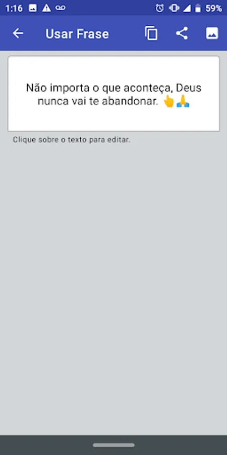 With this super light and easy to use God phrase app you will be able to copy the phrases to WhatsApp status, send God messages as images via Facebook, Tumblr and Instagram.