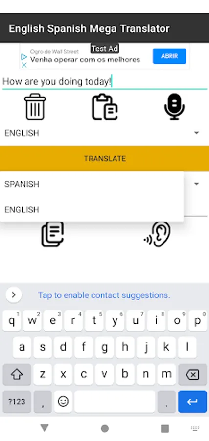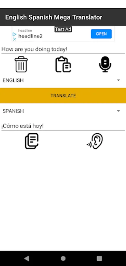 Speak to your mobile phone in ENGLISH or SPANISH and the app will translate to SPANISH or ENGLISH what you say, you will have the translation in text format, to read it, and also you can hear it from the speaker of your device.