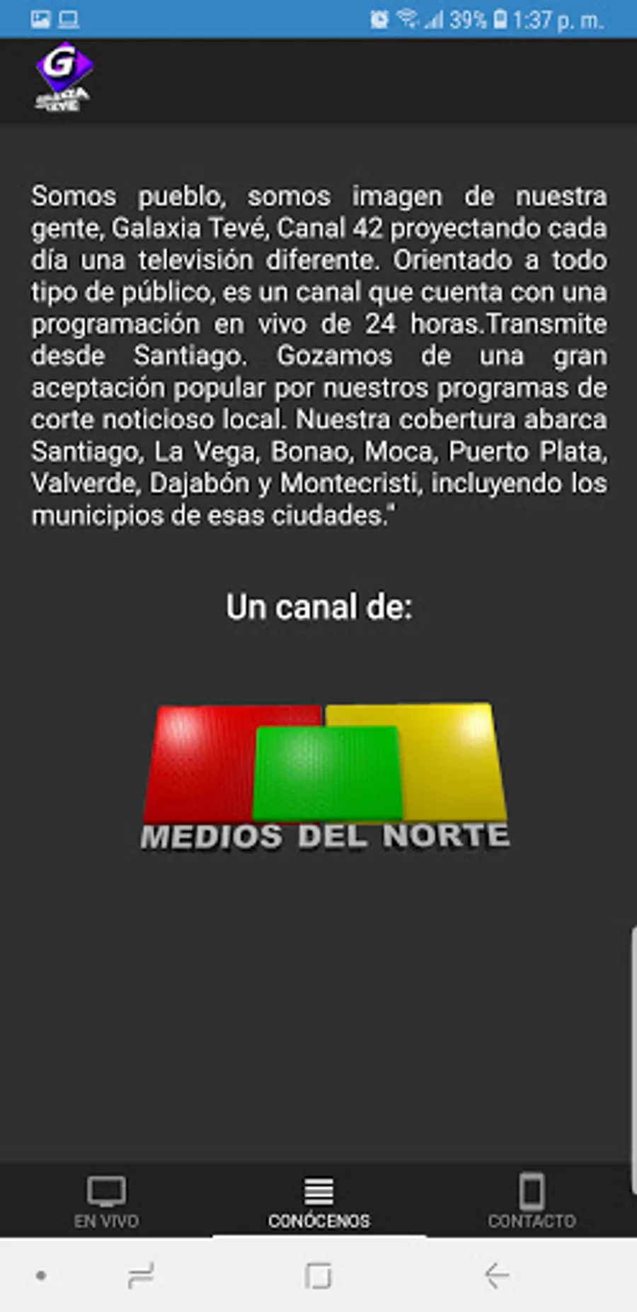 We are a people, we are the image of our people, Galaxia Teve, Channel 42 projecting a different television every day. Oriented to all types of audiences, it is a channel that has 24-hour live programming. Broadcast from Santiago. We enjoy great popular acceptance for our local news programs. Our coverage covers Santiago, La Vega, Bonao, Moca, Puerto Plata, Valverde, Dajabón and Montecristi, including the municipalities of those cities.