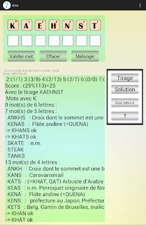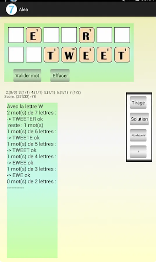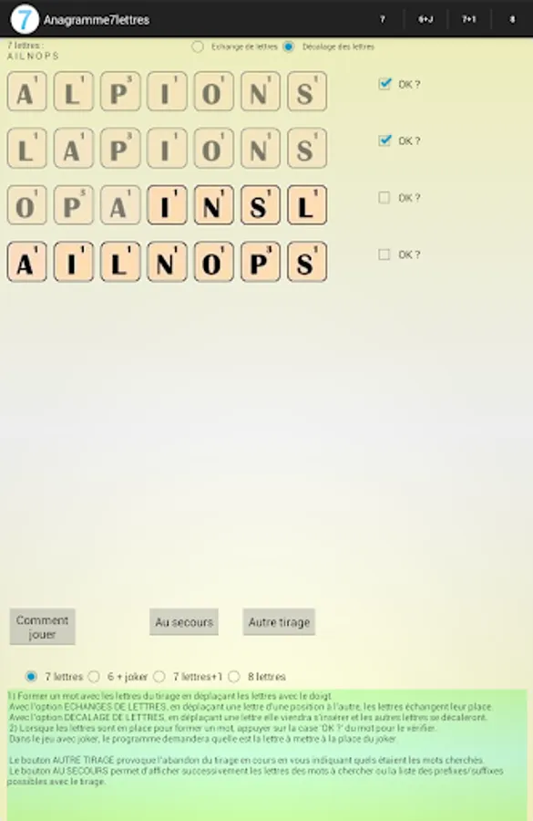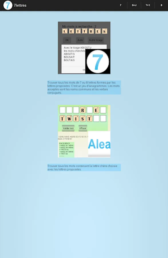 The principle of the game is to find all the words of 7 or 8 letters formed with the proposed letters.