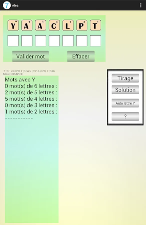 The principle of the game is to find all the words containing the dear letter (J, K, Q, W, X, Y, Z) chosen from the given draw.