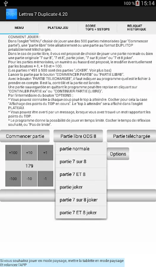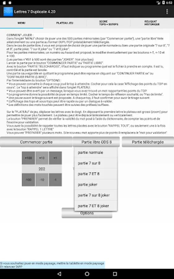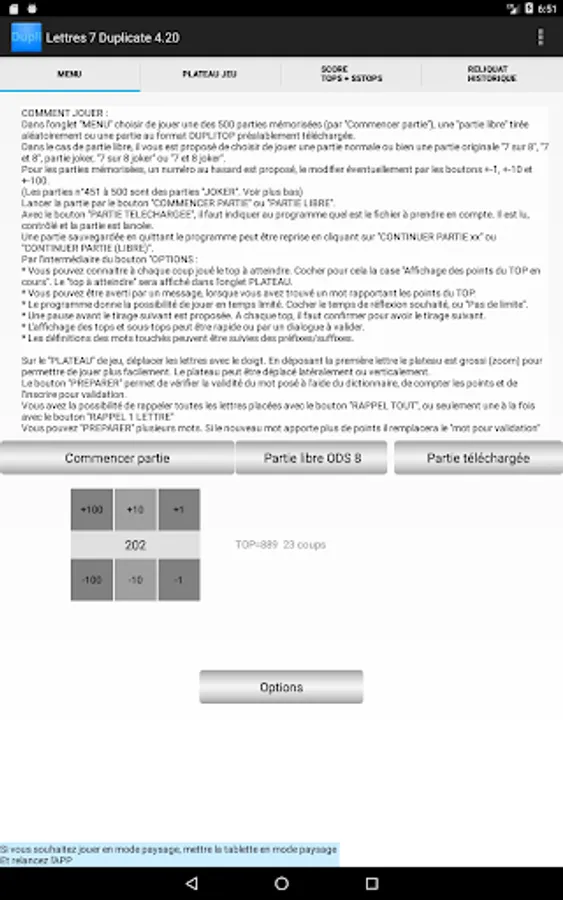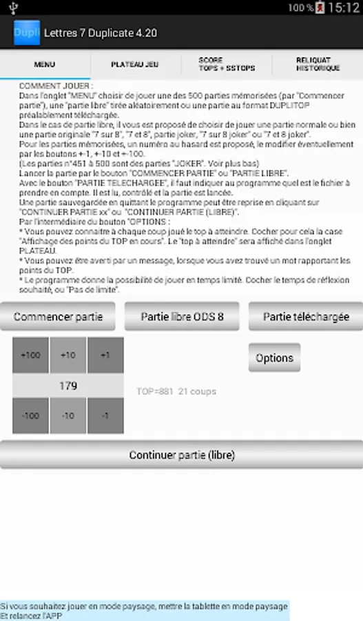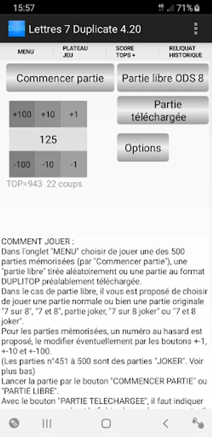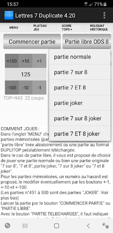 The game offers 500 stored GAMES, 50 of which are "joker" games (numbers 451 to 500, see the rules in the help).