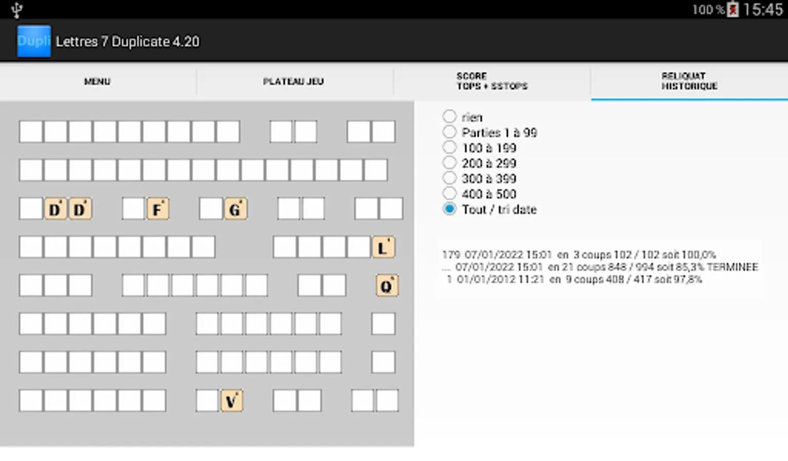 The remainder tab allows you to see the remaining letters as well as the history of the stored games played.