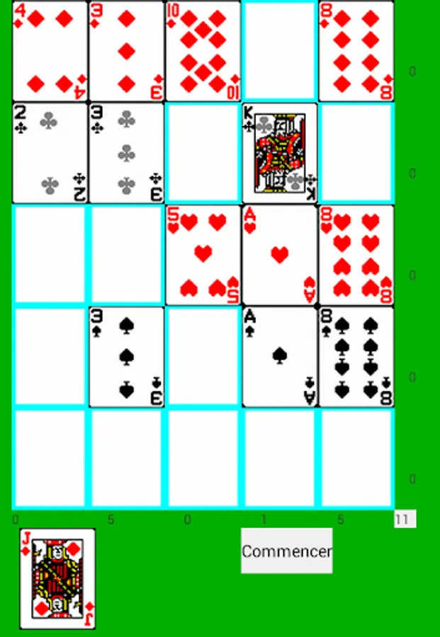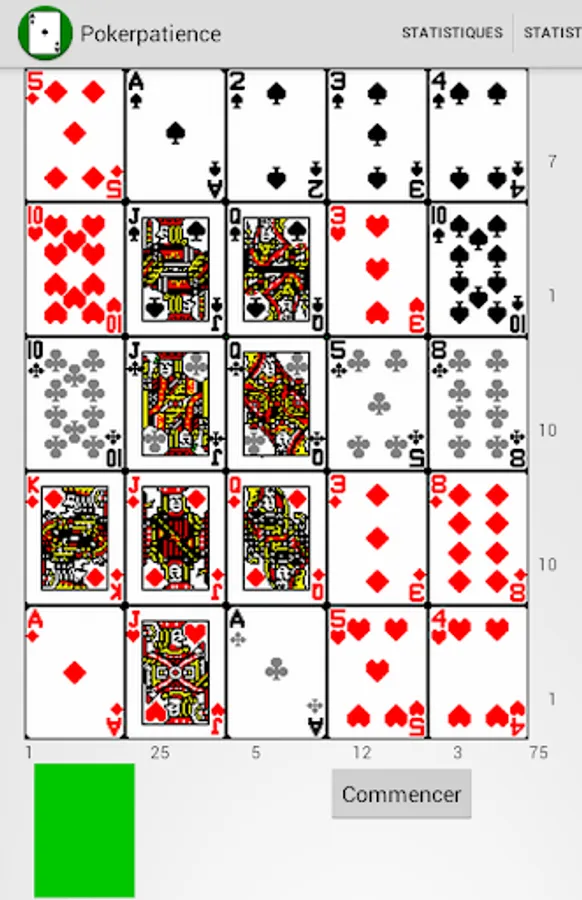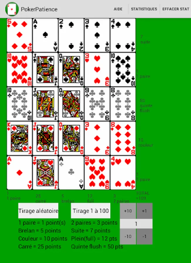 The purpose of this patient is to score the most points by making card combinations on a carpet of POKER 5 out of 5. Points are counted in rows and columns. 2 play opportunities: a random draw and the choice among 100 drawings prepared and delivered with the game