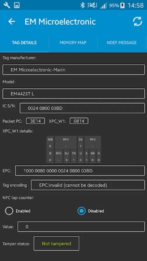 2) An Advanced tag information are available by touching any inventoried EPC code. The new windows which will pop up are depending on the selected IC. If the EM4325 is in the field and selected for advanced information, the tabs are: