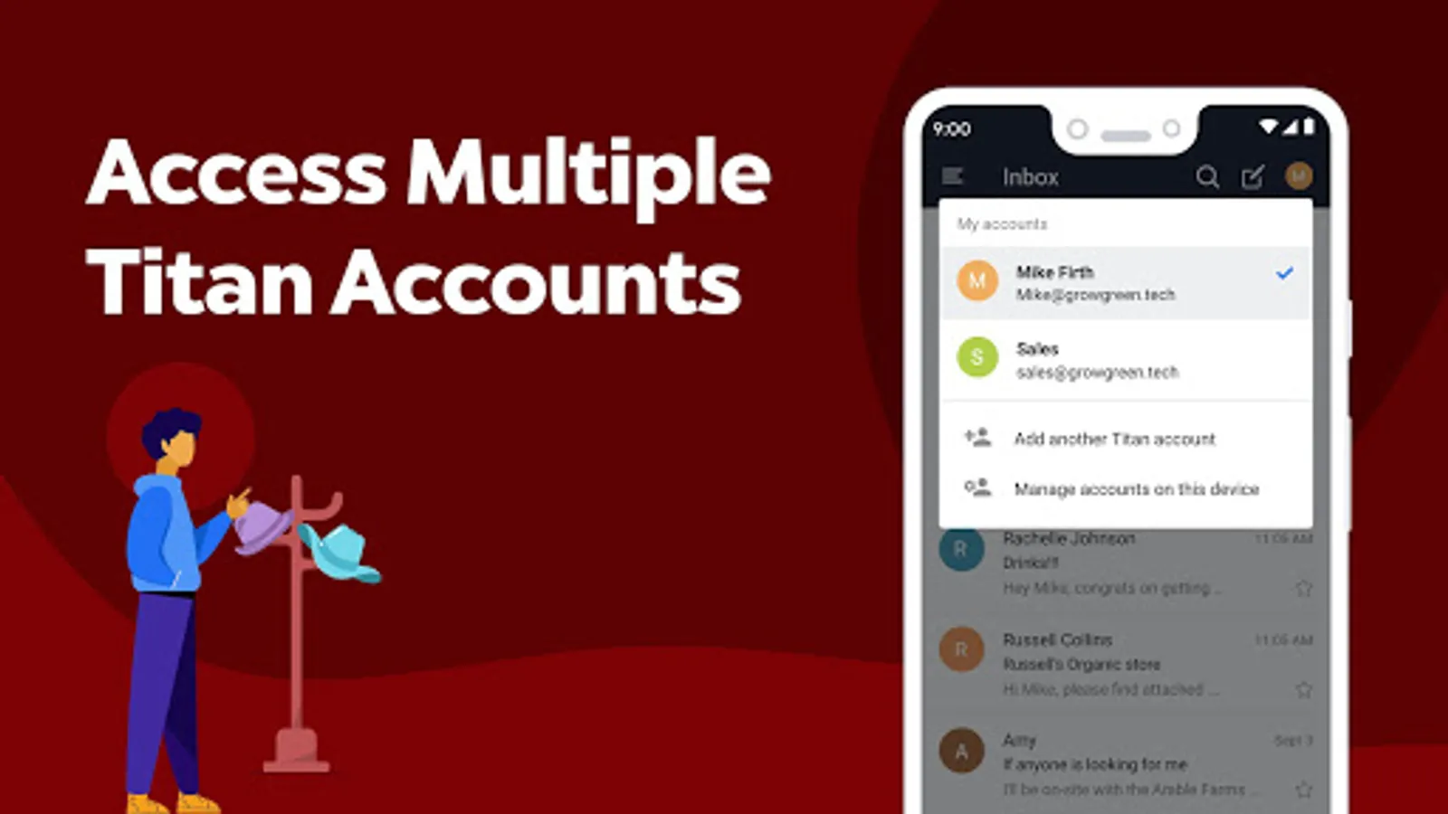 - Access multiple Titan mailboxes (think you@yourbusiness.com, info@yourbusiness.com, sales@yourbusiness.com, etc.) from a single interface. If you're wearing multiple hats and supporting multiple functions for your business, you can manage multiple email accounts right from your phone.