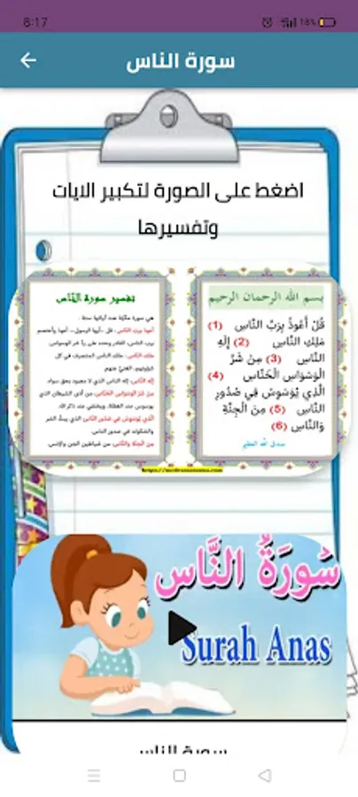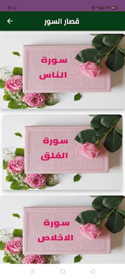 تطبيق قصار السور او السور القصيرة او من خواتيم جزء عم من القران الكريم يحتوي على فيديوهات بسورة الناس وسورة الاخلاص وسورة الفلق وسورة النصر وسورة الكوثر وسورة الفيل وسورة قريش ويحتوي على الايات مكتوبه وتفسيرها
