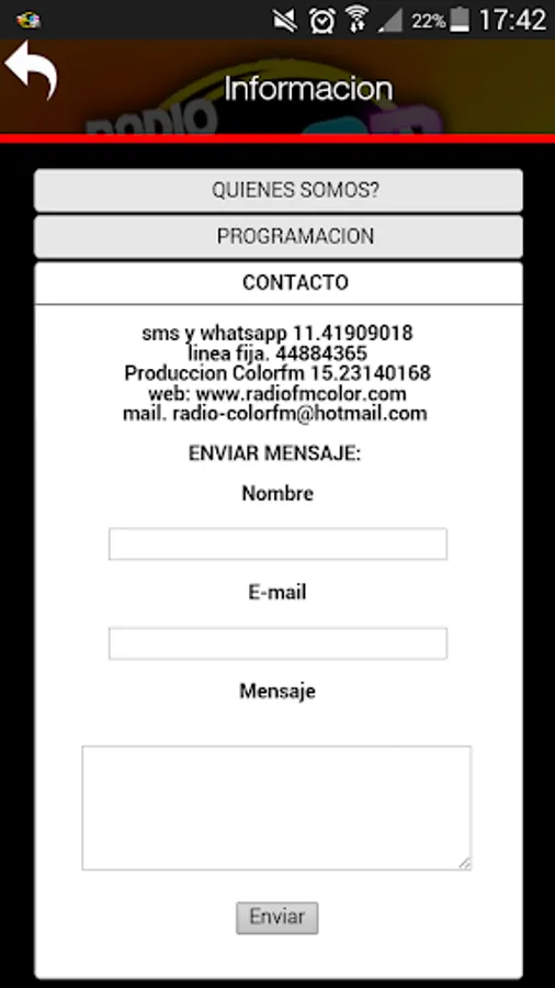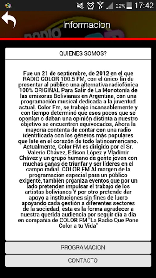 It was a September 21, 2012 in which RADIO COLOR 100.5 FM, with the sole purpose of presenting to the public a radio alternative 100% ORIGINAL To leave the monotony of the Bolivian stations in Argentina, with a musical program dedicated to youth current. Color Fm, is working tirelessly and time determined that those few who opposed or gave an opinion different from our goal are wrong, now the happy most have an identified radio with the most popular genres that beats in the heart of everything Latin American. Currently, Color FM is directed by Mr. Valerio Chavez, Edison Lopez and Vladimir Chavez and a human group of young people eager to succeed and become leaders in the radial field. COLOR FM Besides special programming for a demanding public, also organizes events on the one hand intended to promote the work of Bolivian artists and the other intended to support not-for-profit supporting each management at different sectors of society, this is the way to thank our dear audience to follow day by day in the company of COLOR FM "Radio Putting Color your Life"