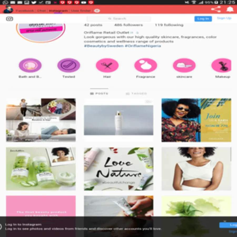 It also has facebook and instagram page where you can view a physical product, Oriflame where you can like and follow on instagram, it also has a user finder.
