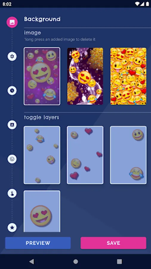 Emoji Live Wallpaper ❤️ Wink Emoji Hearts Themes has multiple moving wallpapers with smiley and parallax emoji images, hearts backgrounds, wink emoji HD wallpaper, multiple customize options like background changer, frames, animated funny emoji, magic touch, analog clock, emoji, your name and more, that work on the lock screen and they are all FREE!