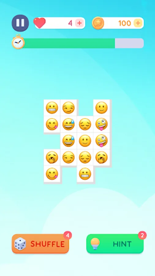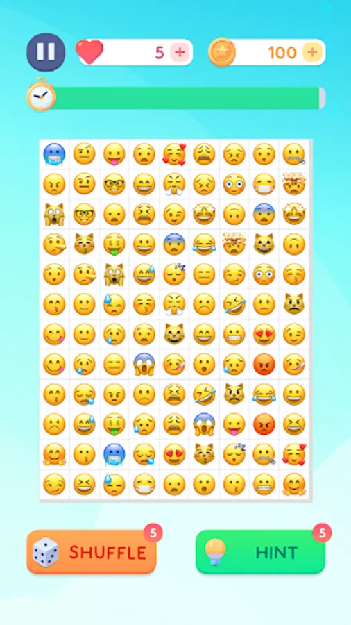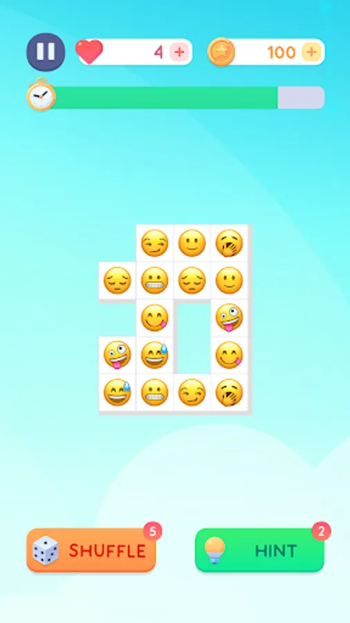 - The upper right corner indicates the number of lives. If there are no more pairs left on the playing field, the tiles will be shuffled, and the number of lives will decrease by 1. It also indicates the time for which you must complete the PaoPao Emoji Connect Onet game, if you do not have time to complete the PaoPao level, then you will lose.