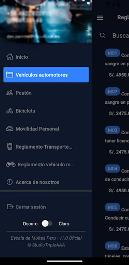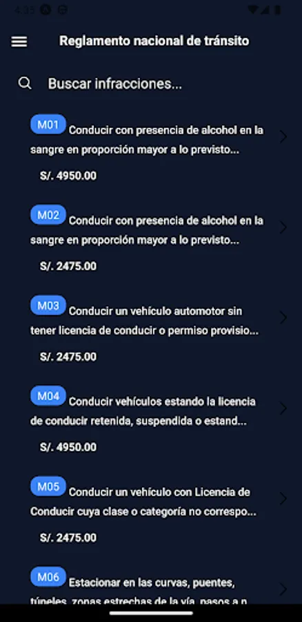 Scale of Fines Peru is an App at the service of the general public within the Peruvian territory, since it contributes and informs all its users in relation to administrative offenses and fines that may be incurred in terms of National Traffic Regulations, Traffic Regulations, Cargo Transportation and Minor Vehicle Regulations, It should also be noted that Scale of Fines Peru only uses public and open access information and complies with disseminating and informing it.