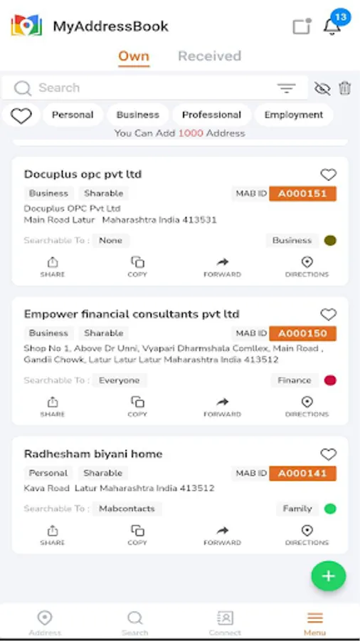 My Address Book is an easy way to reach the desired address. Every address has given a unique universal id i.e MAB id which is a Alpha numerical code one can easily remember. Now you can find, share and navigate to exact locations using MAB id.