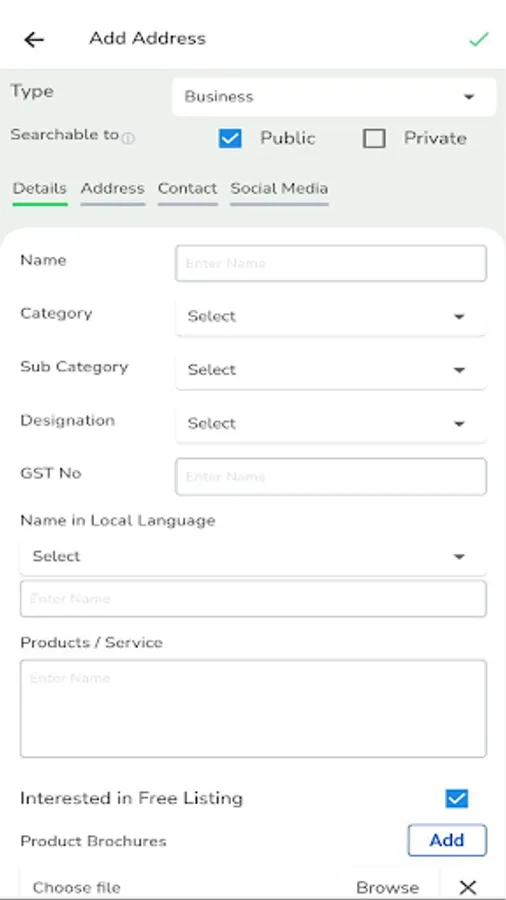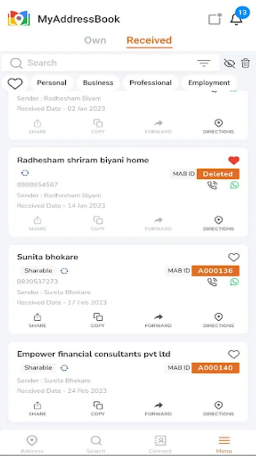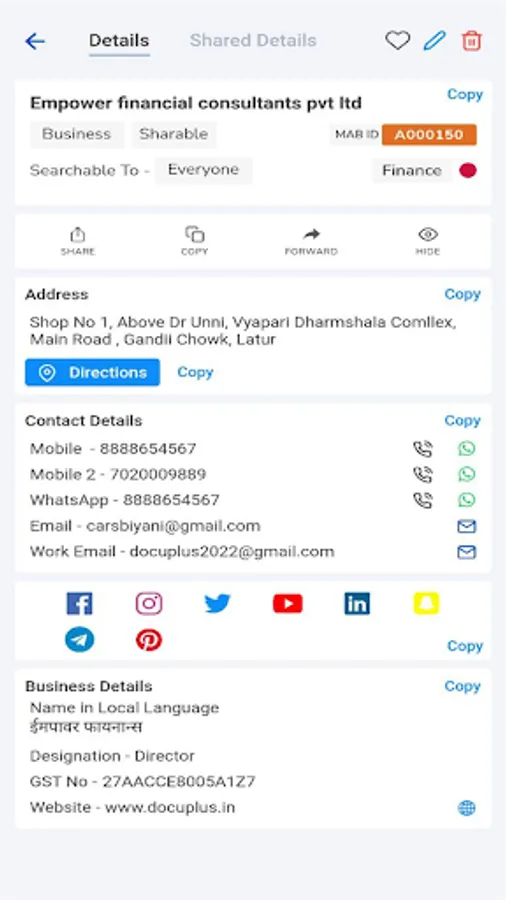 Easy address share facility with Selected details via Whatsapp/SMS/ email