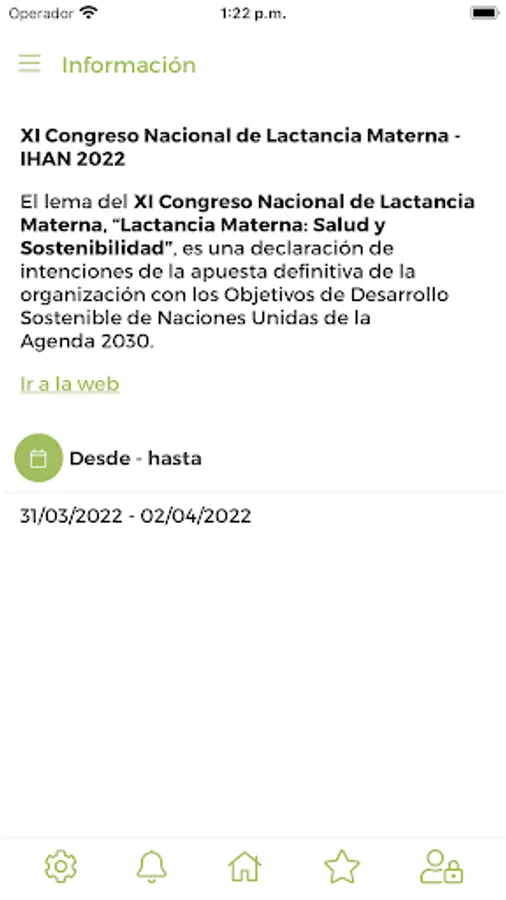 En la aplicación oficial del XI Congreso Nacional de Lactancia Materna 2022 podrás encontrar toda la información sobre el evento: Sede, agenda, ponentes, contacto con la organización, etc.