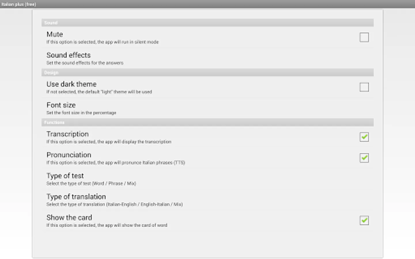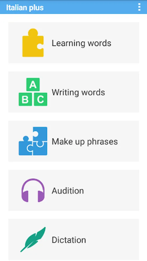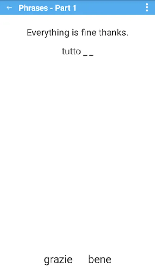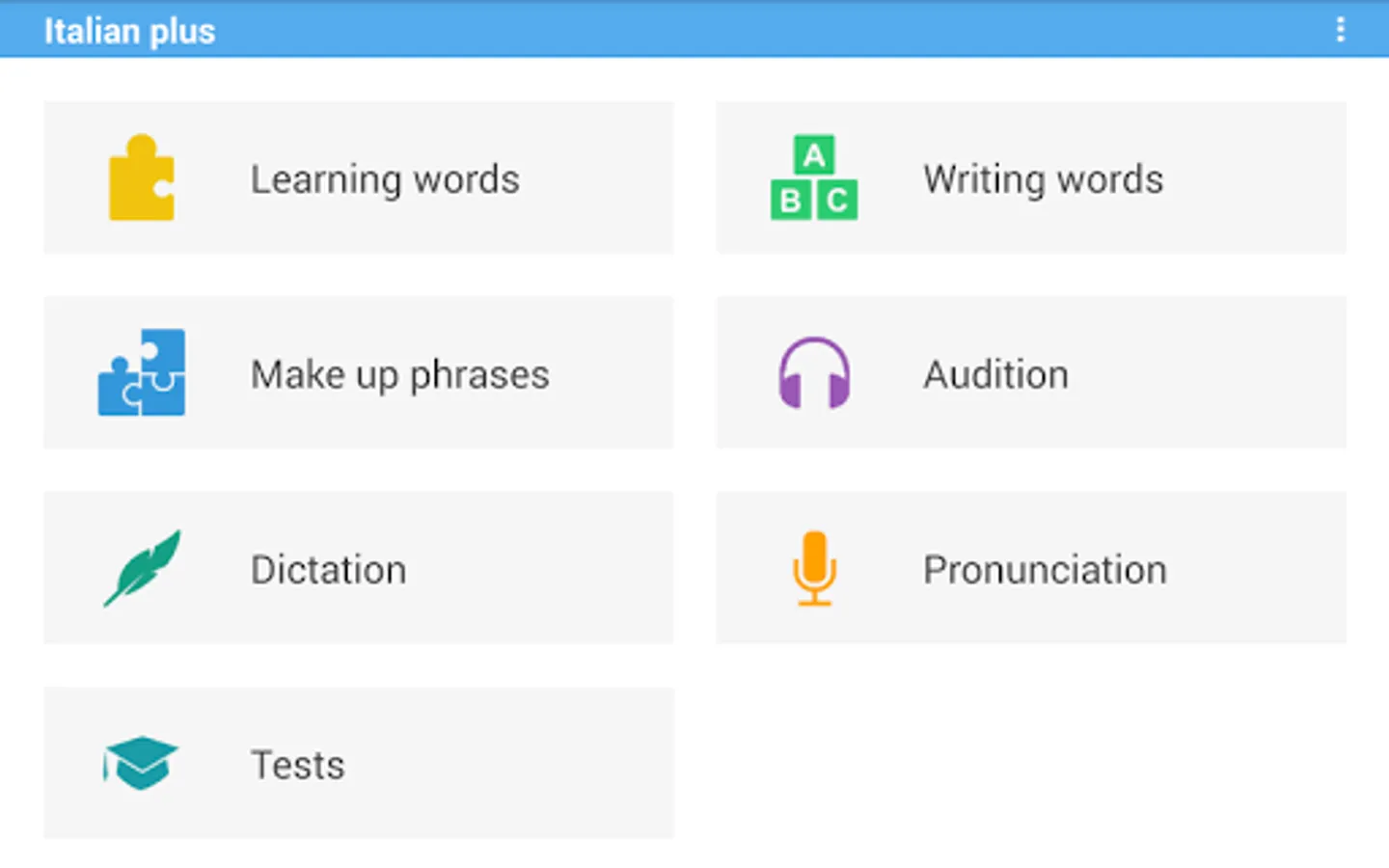 This application will help you to learn Italian language in easy and interesting way. You will find that phrases are easier to remember, because they have meaning, they paint a picture, they tell a story.
