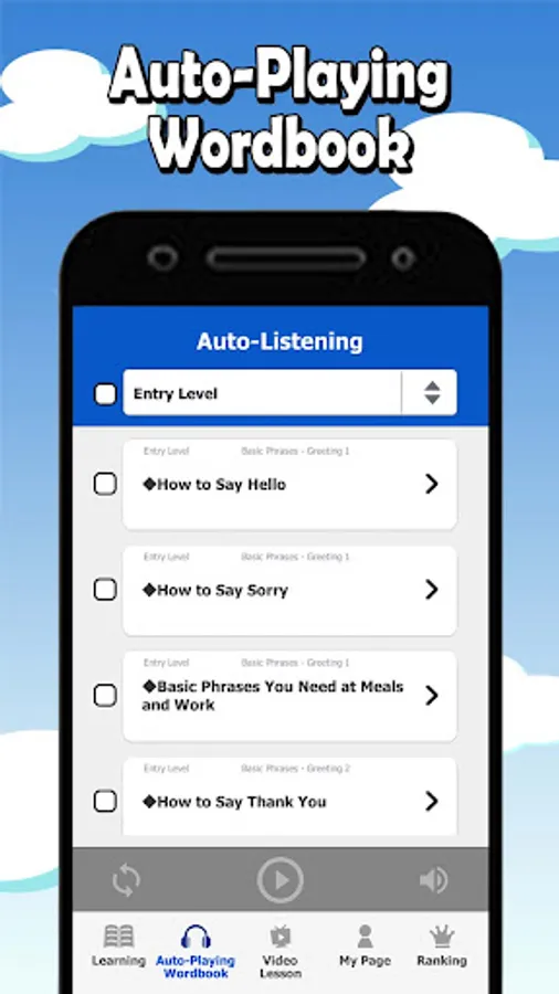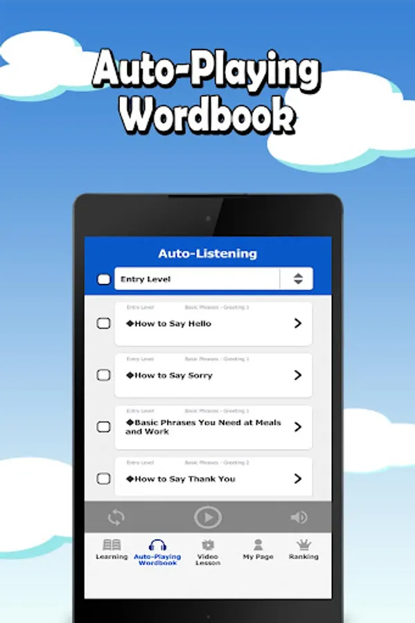 ・ Audio playlists and 1/2 speed playback make it easy to memorize words