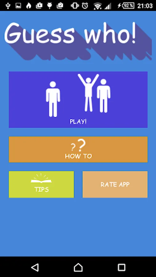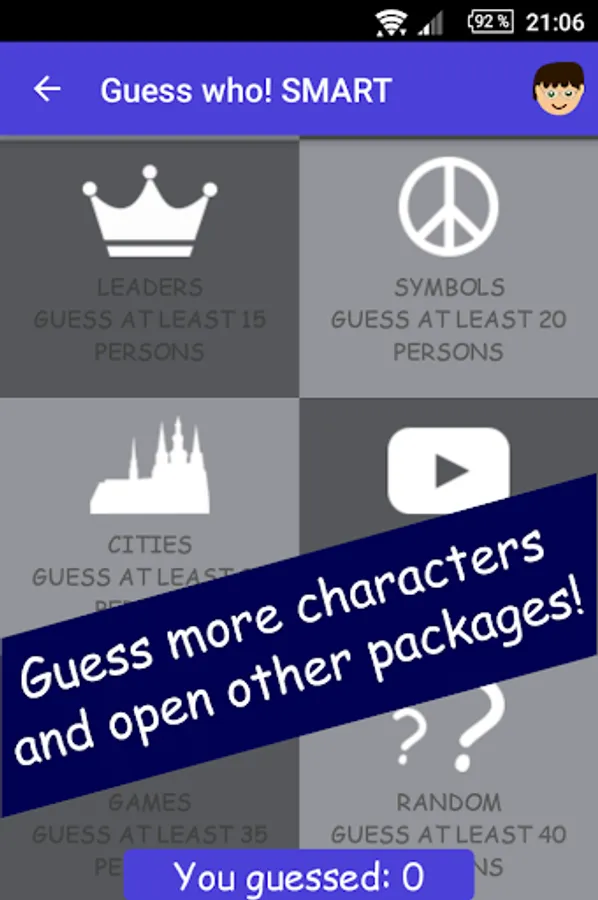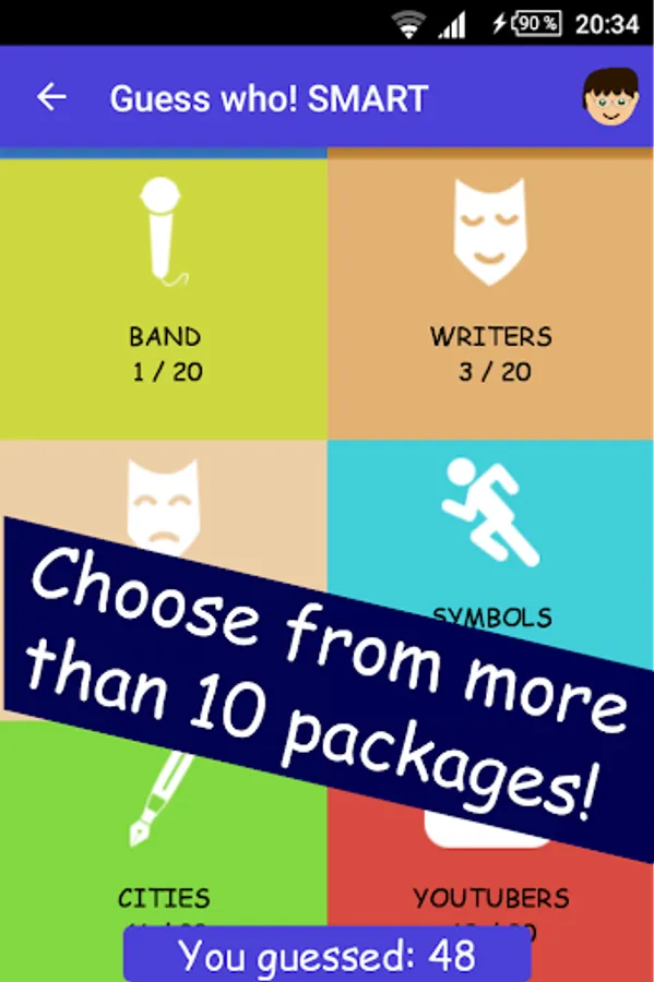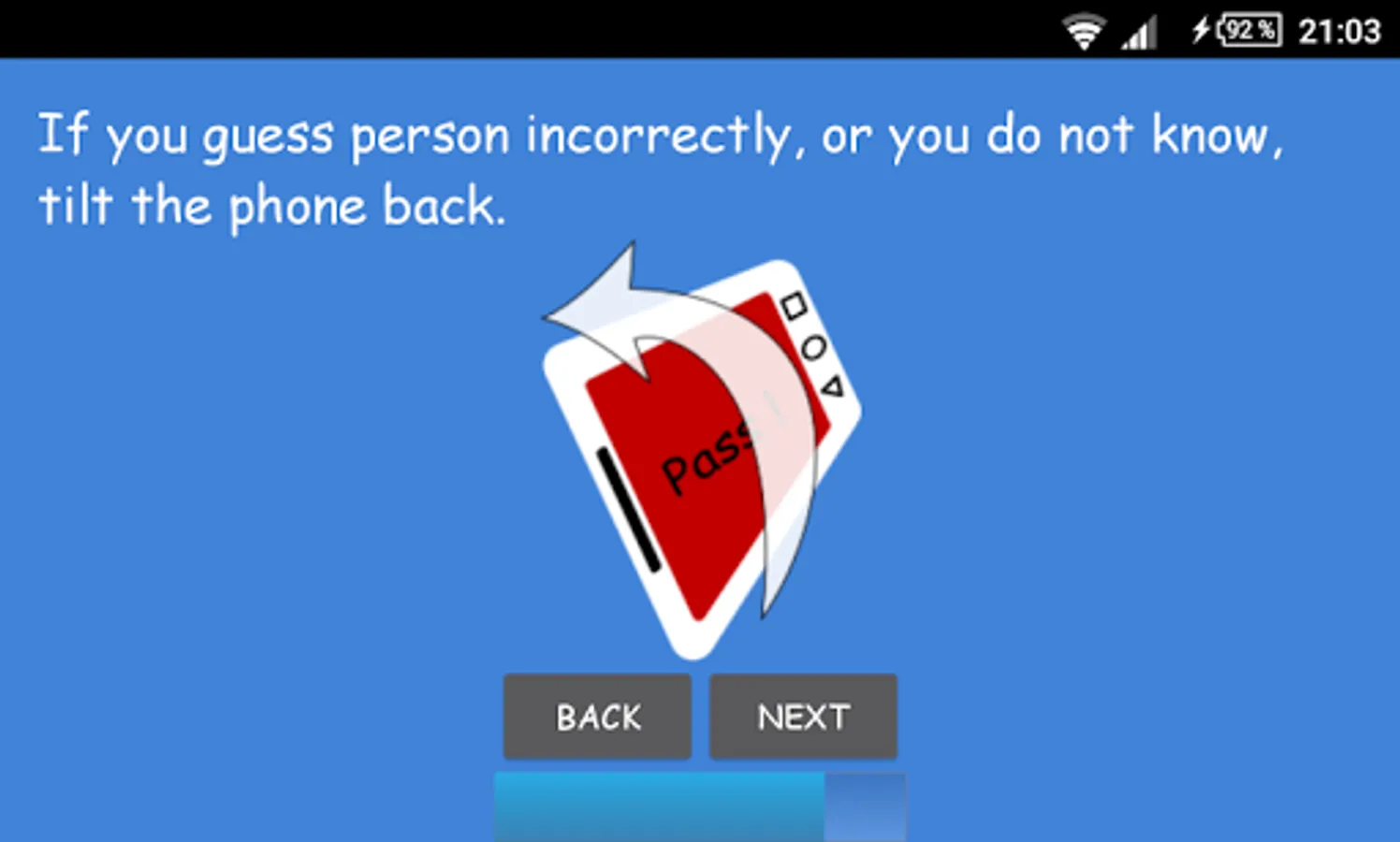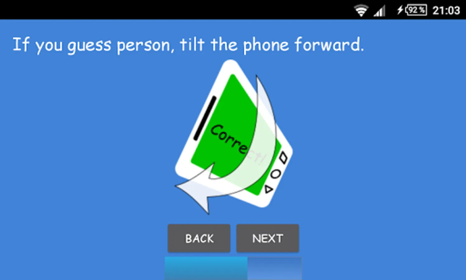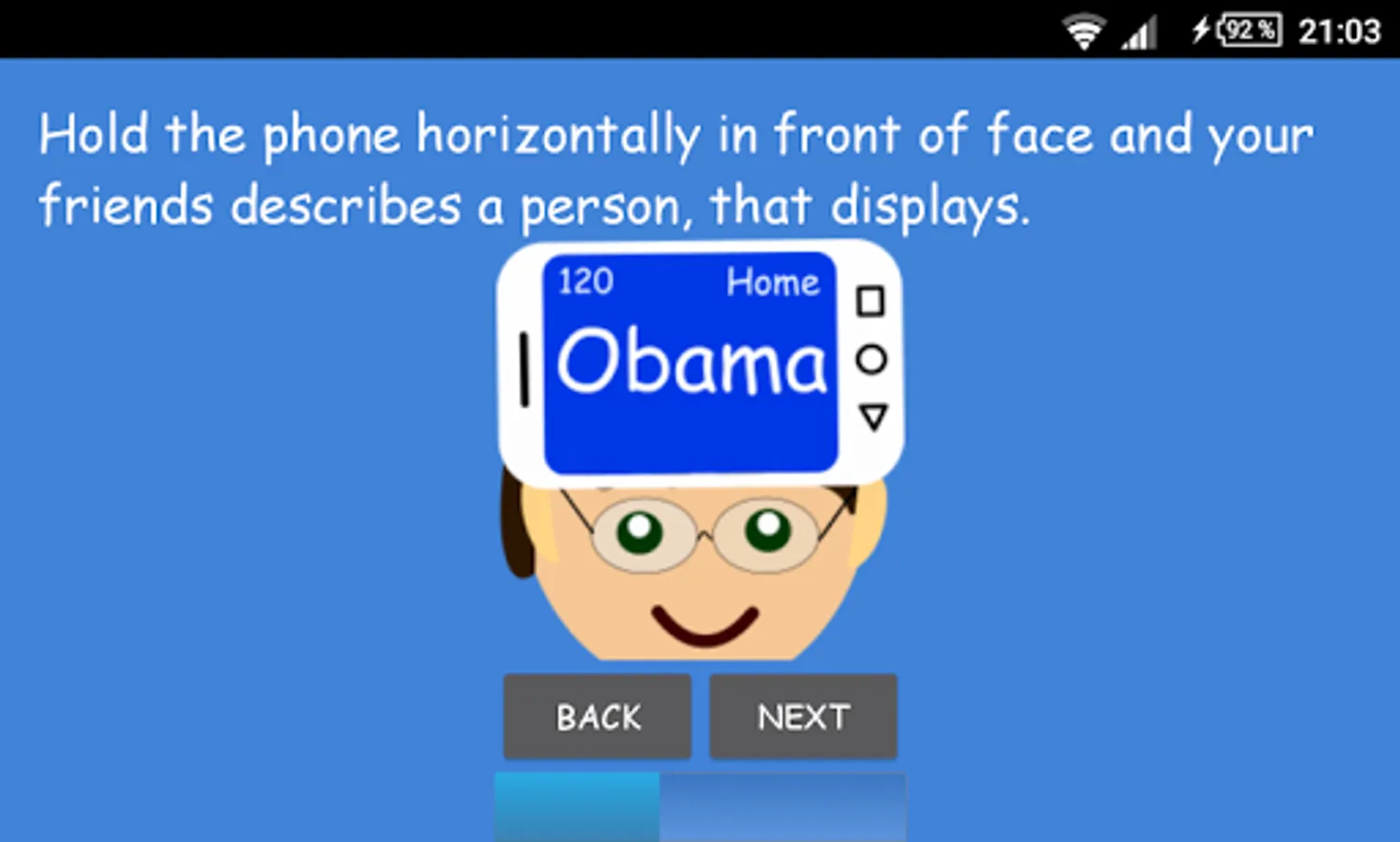 Choose a package and click on the screen to start the game. Put your cell phone in front of your forehead to the horizontal position and your friend will start describe you the personality that appears on the screen.