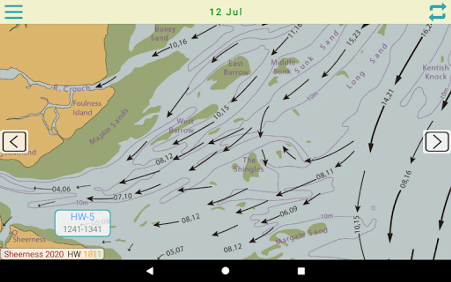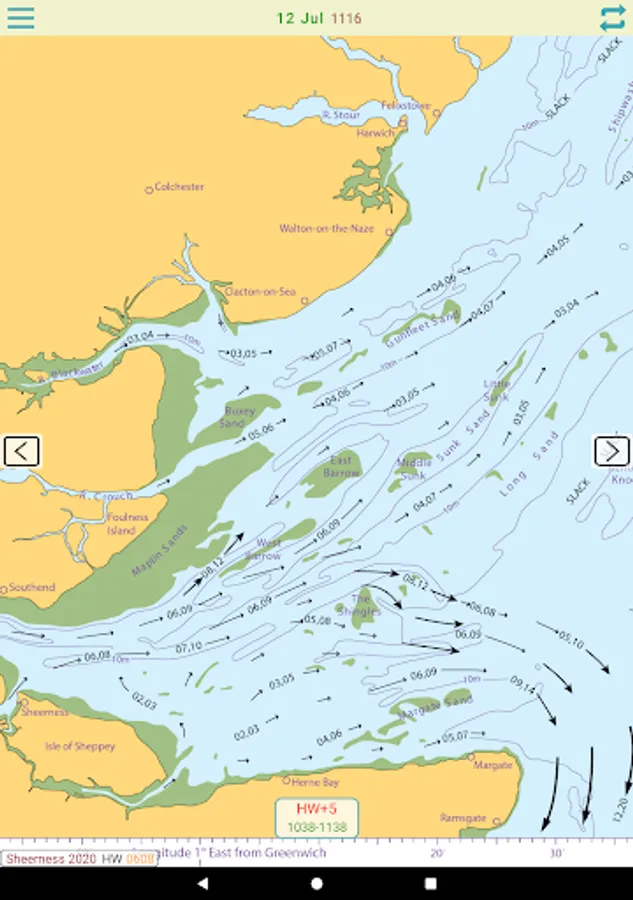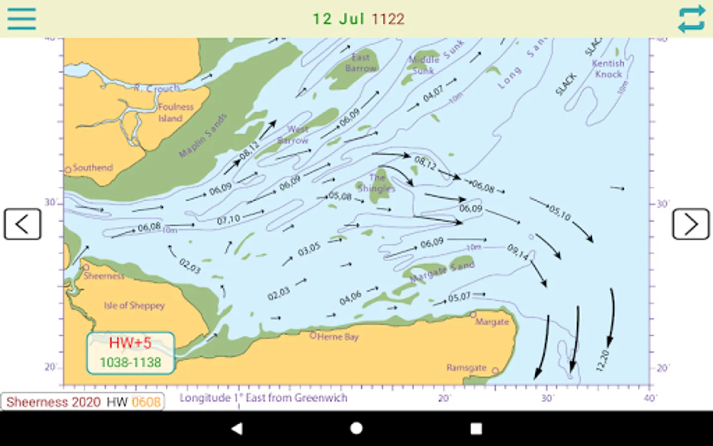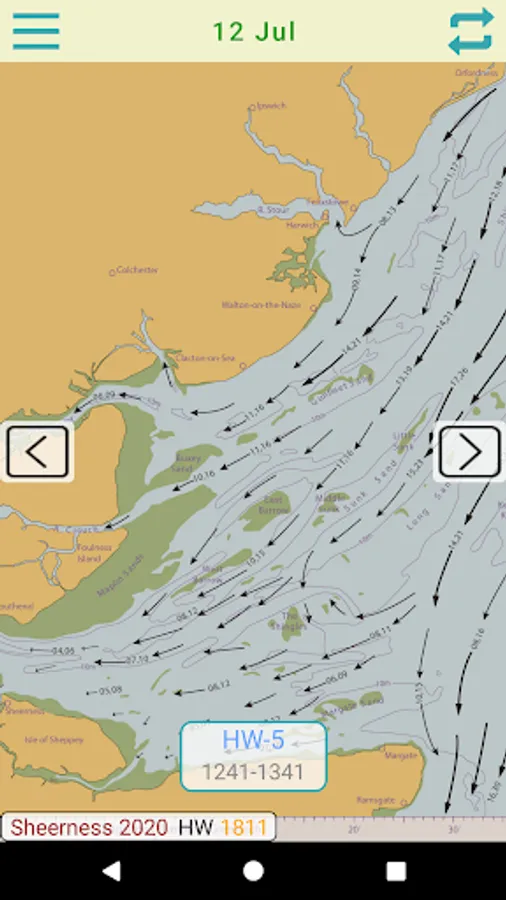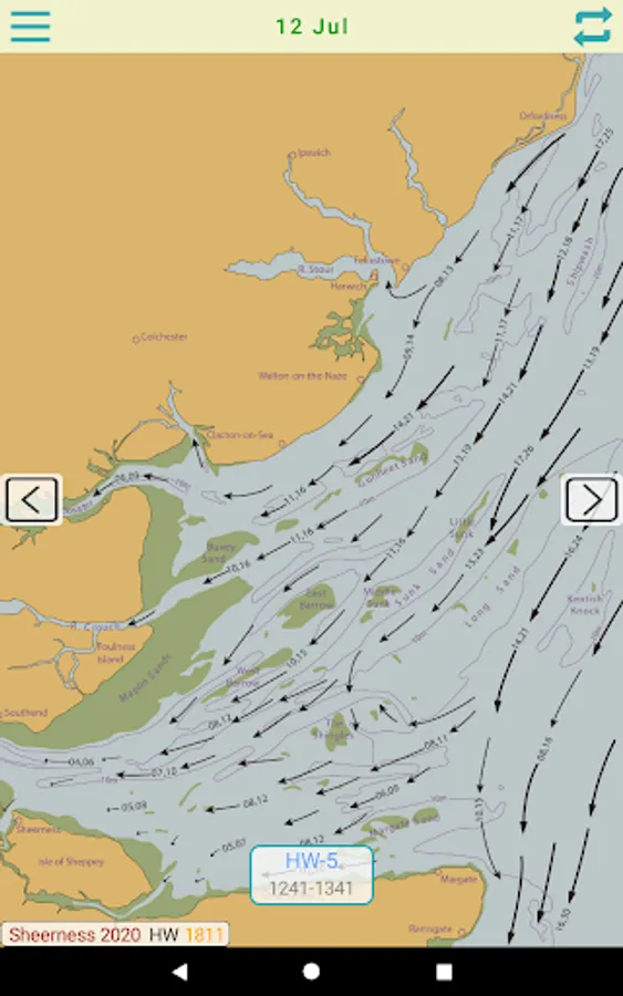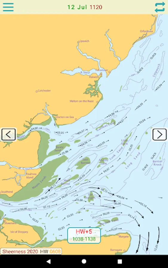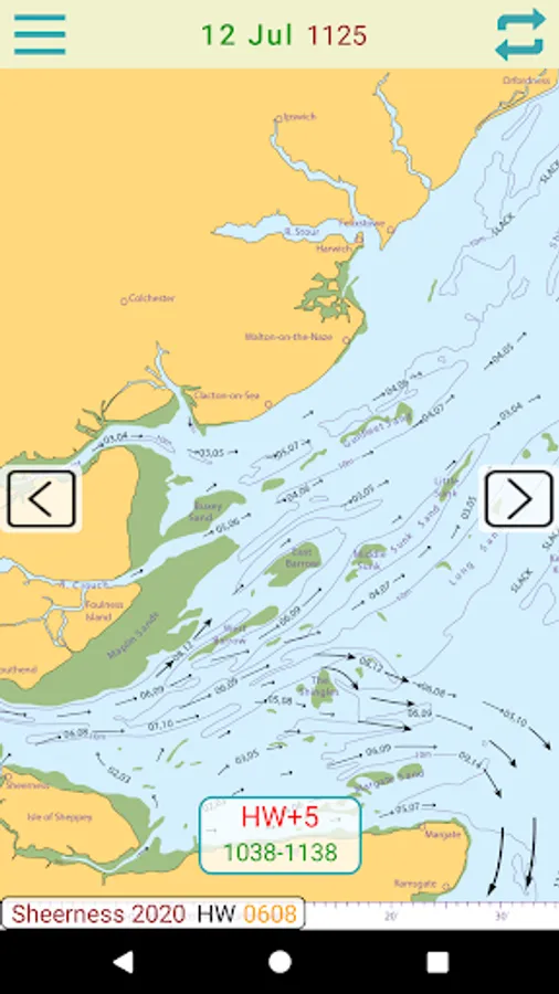 The app automatically selects the nearest Sheerness HW time of the day, but if you want to see data for the next or previous HW of the day, swipe forward or back to advance the tidal hour.