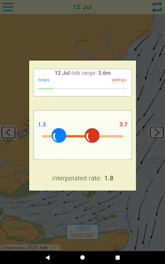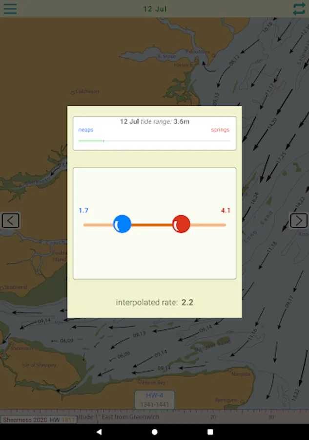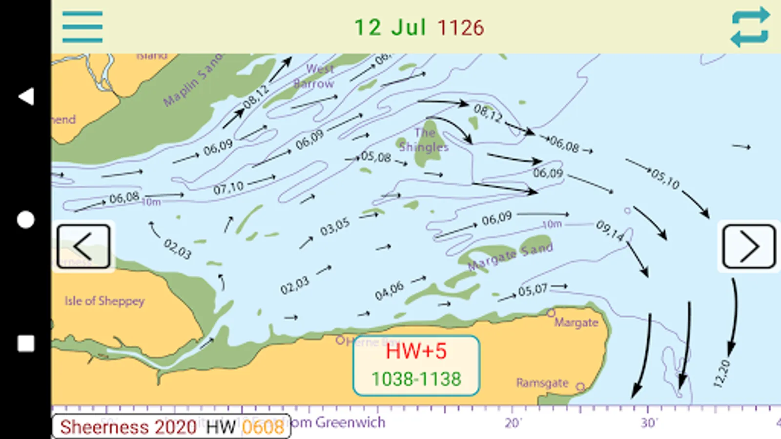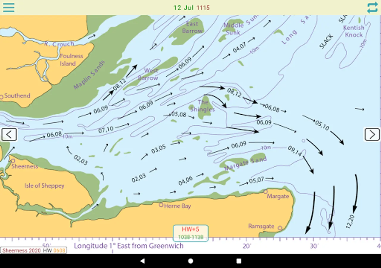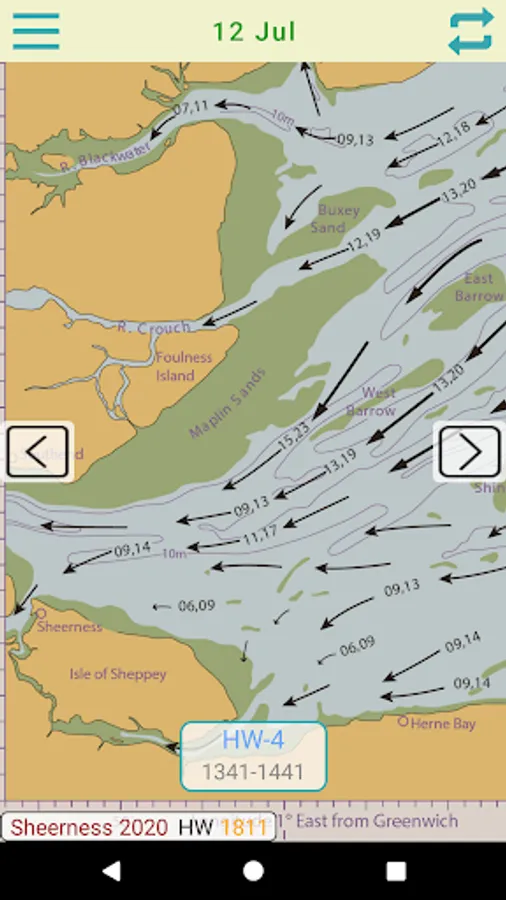 The app automatically selects the nearest Sheerness HW time of the day, but if you want to see data for the next or previous HW of the day, swipe forward or back to advance the tidal hour.